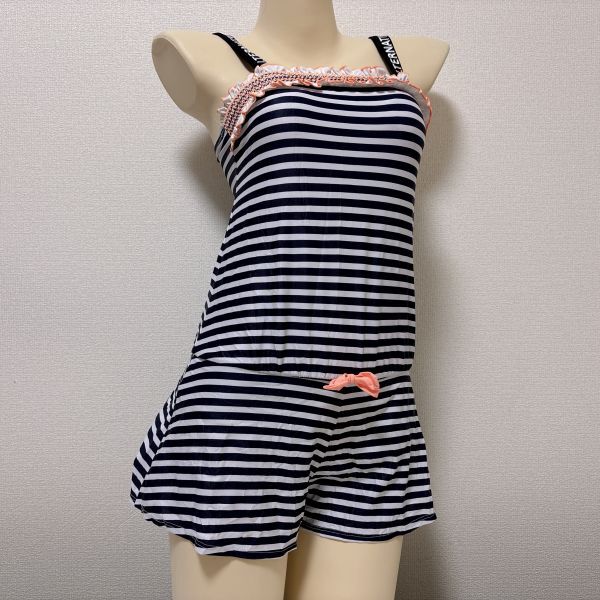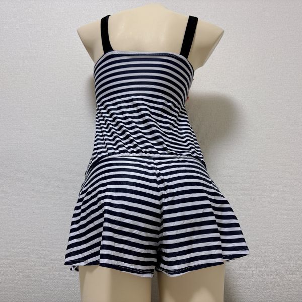 19 ALGY女子競泳水着160(Lサイズ程度)★スカートタイプ・股上ハイレグ★白黒ボーダーフリルリボン付きロゴストラップ★大きいサイズ男性も
