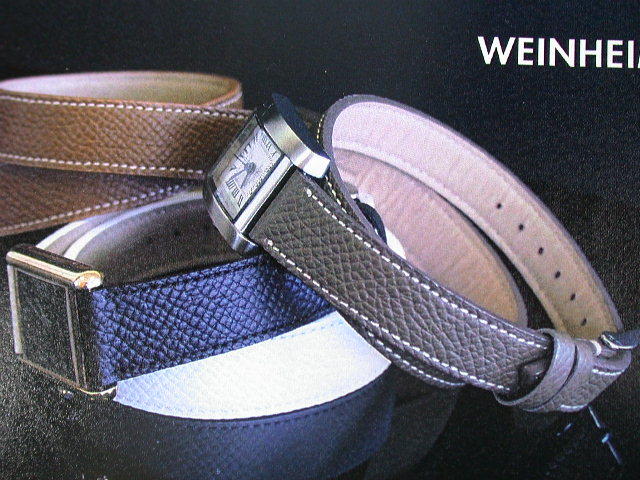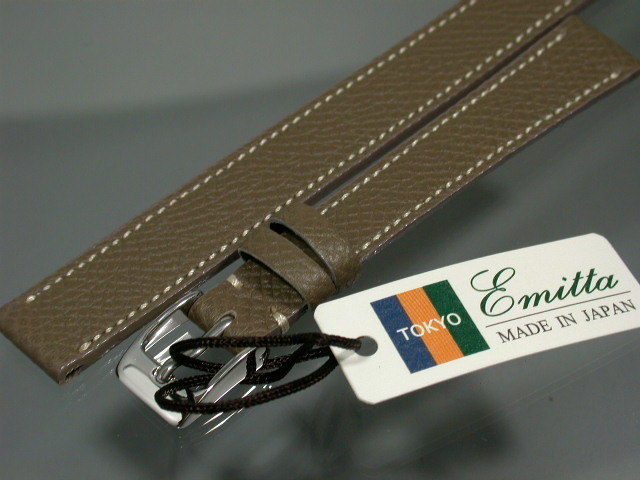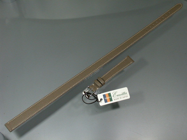 ○素材/カーフ型押し(ドイツ産) ステンレス美錠 ○色/トープ ○メーカー/ MIMOSA Emitta 08000XEW2-T12 ワープロラックス/2重巻き ●かん合部(バネ棒取付部幅)/12mm ○美錠幅/10mm  ○親側寸/約70mm(美錠は含まない) 剣先側寸/約295mm ○上面フラット 厚み/約2.2mm ○仕立て/切り身