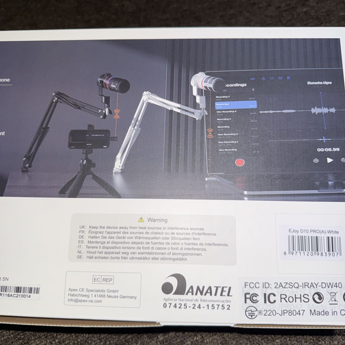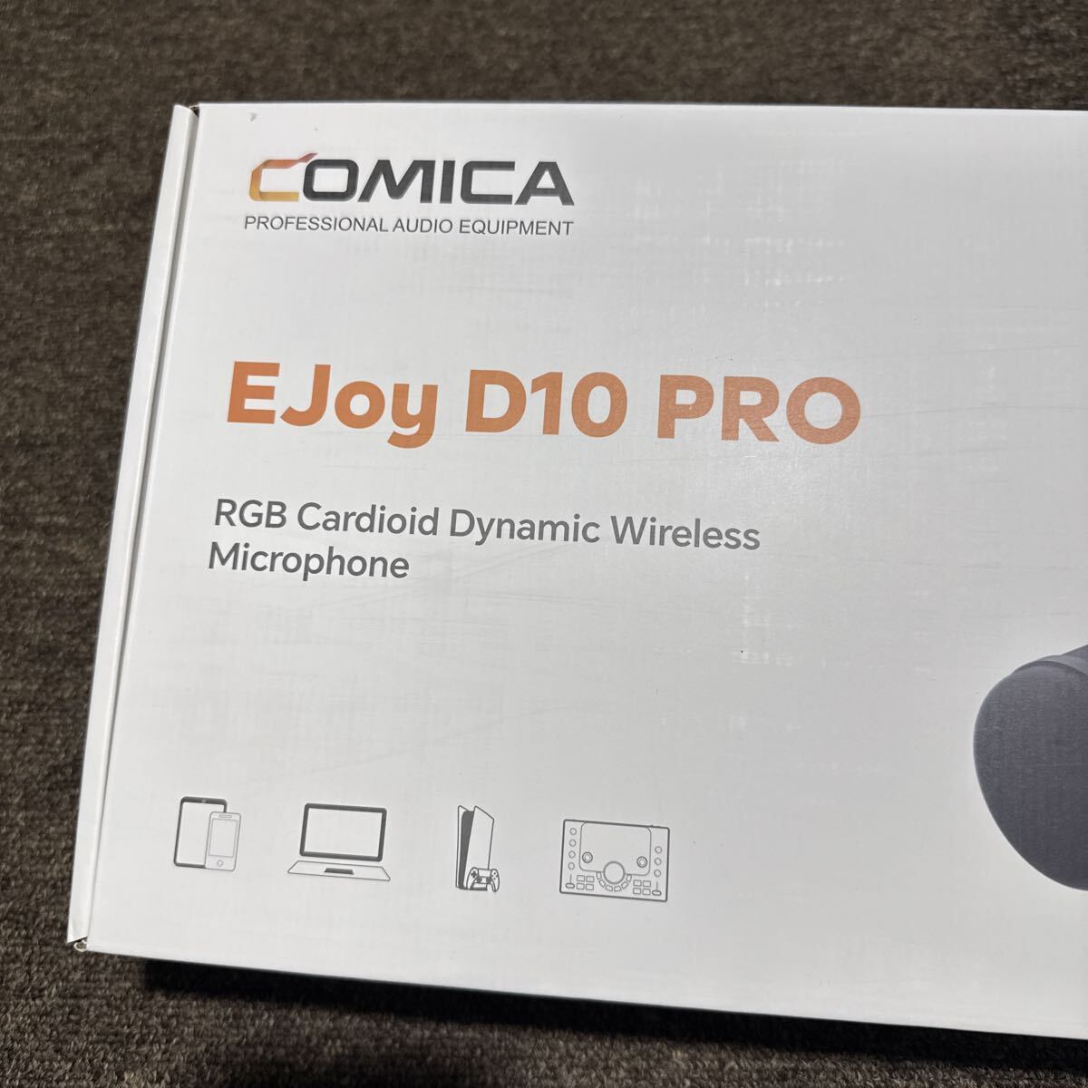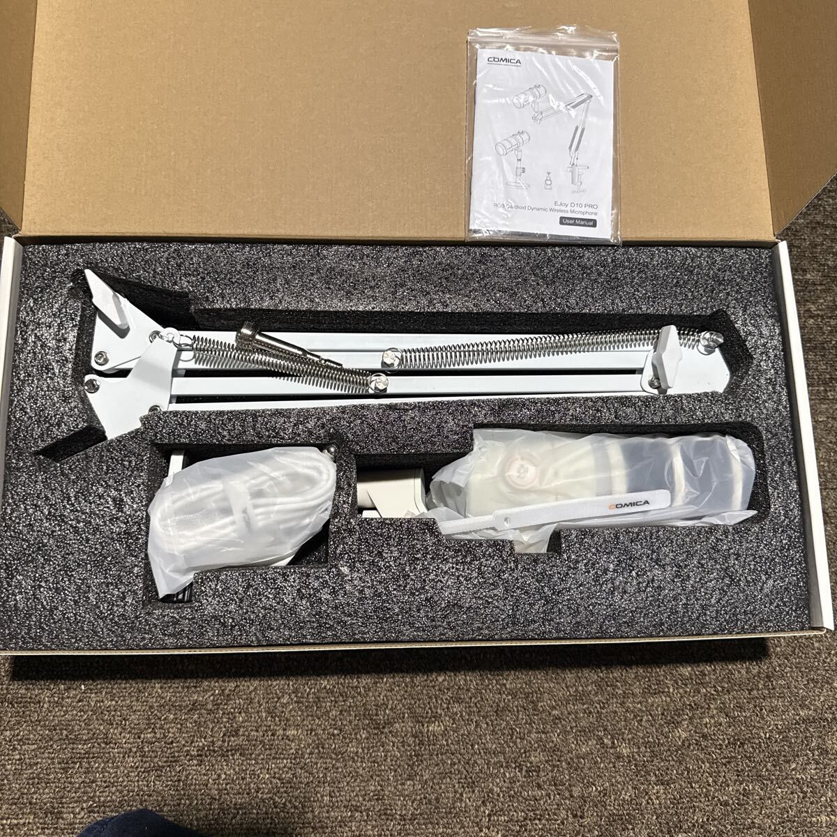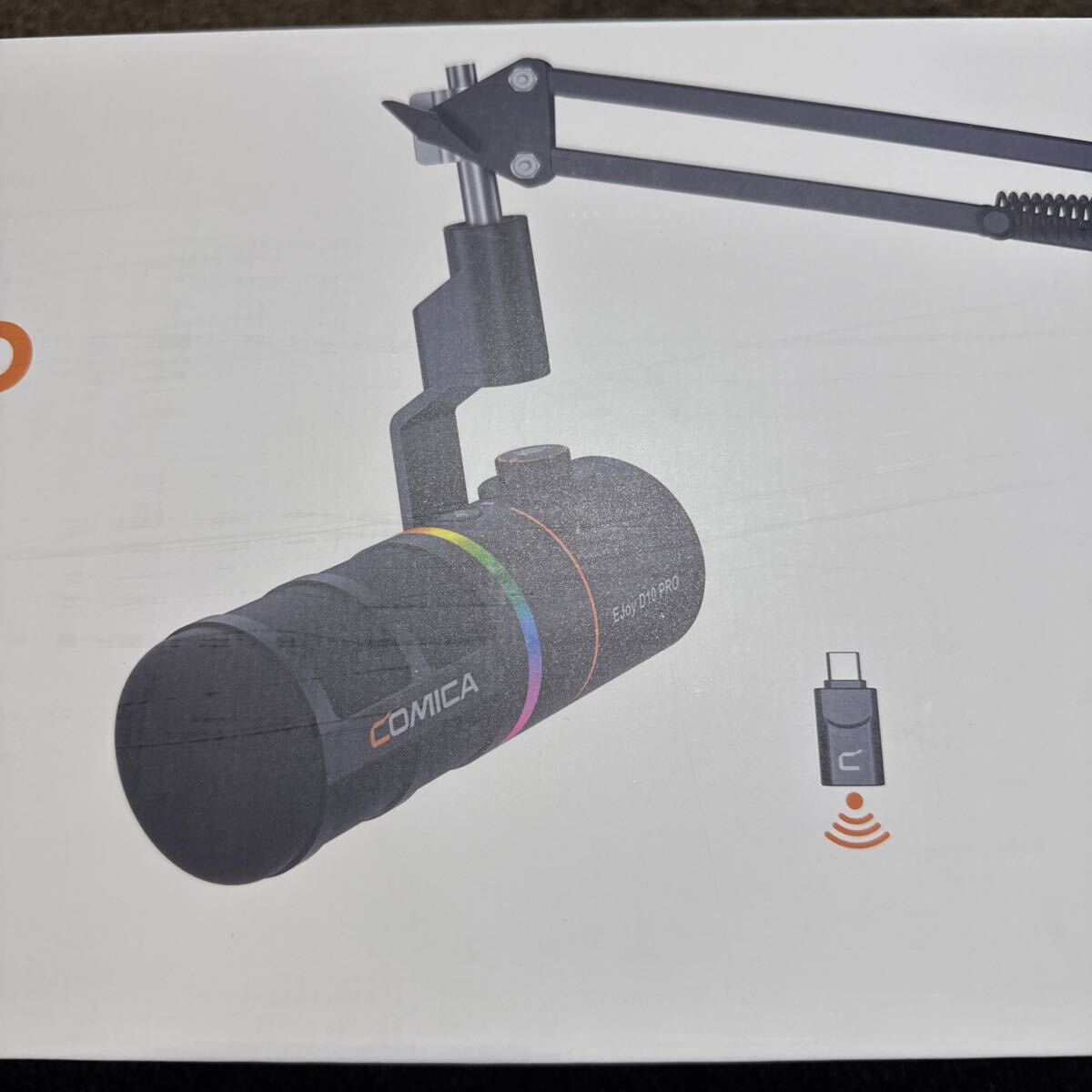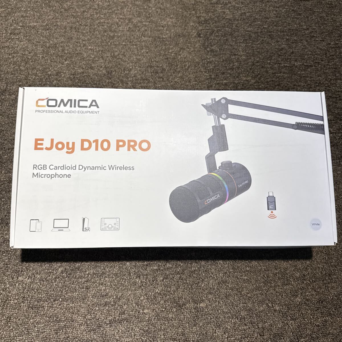 COMICAのデスクトップ用ダイナミックマイクです。小型のコネクタをつけてワイヤレスでも使うことができます。デスク用アームスタンド付き。色はホワイトです。ほぼ未使用品。