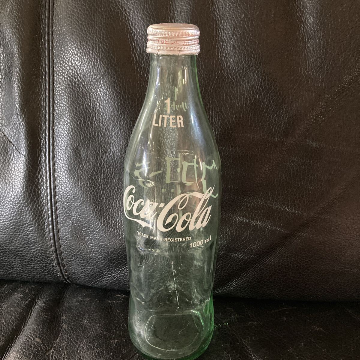 35年位前に購入当時コカコーラのデザインが好きで状態の良いものを選んで部屋に飾っていました。なので状態は良いと思います。傷なども少なく割れなどもありません。赤いラベルではない初期モデルかと思います。お馴染みの1リットルガラス瓶モデルです。瓶だけで確か30円でお店で交換してくれた記憶があります。お部屋のインテリア、ガレージの飾りなどにしてみてはいかがですか?見栄えすること間違いなしです。
