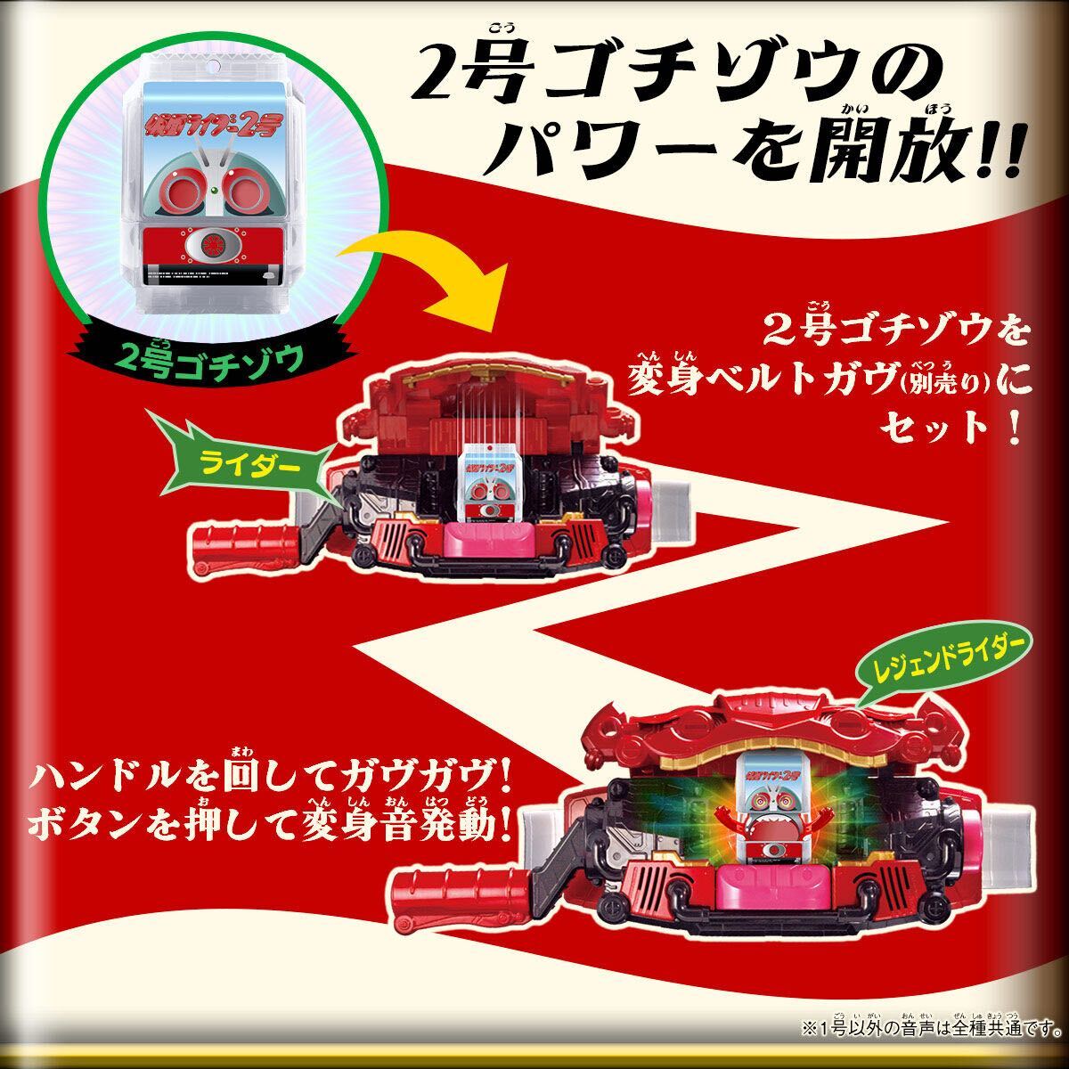 1号ゴチゾウは別売りの「DX変身ベルトガヴ」で個別認識が可能。ベルトにセットすることでゴチゾウが歌う固有の音声が楽しめます。その他のゴチゾウも、DX変身ベルトガヴと連動が可能。ベルトにセットすることで、共通の音声が発動します。
