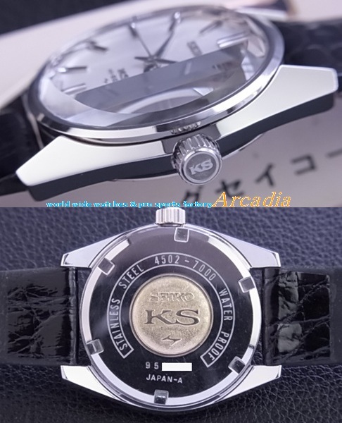 case-SS側/特殊3面カットクリアレックスガラス 新品SEIKO製最高級黒革本クロコベルト hand lether strap KS純正SS銀色尾錠-KSマーク付き純正SSステンレス尾錠(SEIKO STAINLESS STEEL T内刻印有) 約53g(本体/ベルト/尾錠含み) 手巻き デッドストック品の為非防水 |