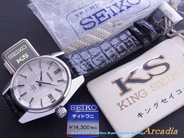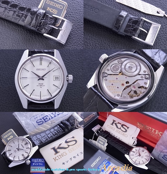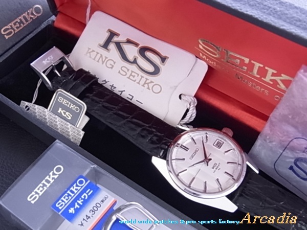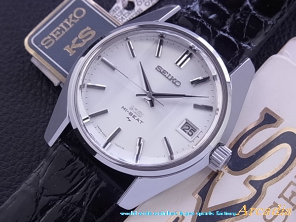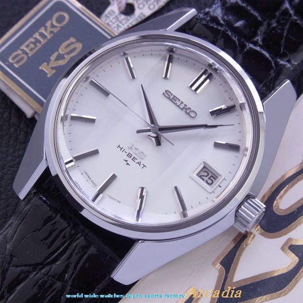 古き良き時代の生粋純日本製最高級!スイス天文台コンクール優秀級!「◎受板特別調整個体番号№331642刻印付き」、手巻き式腕時計KS4502AキングセイコーSS/初期レア7000型SS鏡面ステンレス側(7001側型よりラグが極太)、最初期型極稀少クロノメータームーブメント搭載の「デイト付き45KCM/C」、銀座和光限定最初期型極レア「特殊縦3面クリアレックスカットガラス仕様」、しかも、貴重なKS7000側型の「セイコースタイル極太シルバー鏡面ケース/シルバーホワイト放射状文字盤仕様」の登場です! ●時代の最高級時計の代表キングセイコーで中でも大変稀少な「KS4502AシルバーSS7000型手巻き10振動36000ビートKING SEIKO●最初期型クロノメータームーブ搭載デイト付きモデル」であり◎極最初期型「銀座和光限定特殊縦3面クリアレックスカットガラス/鏡面SS側仕様」の7000C型(◎7001型の後期型より製造数が少ない一品)のKSは現在においても大変貴重でレアな逸品腕時計です。デッドストックものとして大変入手困難で昨今流通量も大変少ない腕時計で貴重品です♪ ◎1969年初期型に受板特別調整個体番号№331642刻印付き最初期クロノメータームーブメントが搭載された本時計は大変レアで貴重な一品です!。(通説では1969年以降製造品に稀に搭載)、時代の高級時計の代表「キングセイコー」で中でも大変稀少な、「1969年亀戸精工舎製初期型レア物、特殊縦3面クリアレックスカットガラス/●特別調整個体番号刻印付きクロノメーター優秀級ムーブメント搭載品」の腕時計です♪ ![]()
