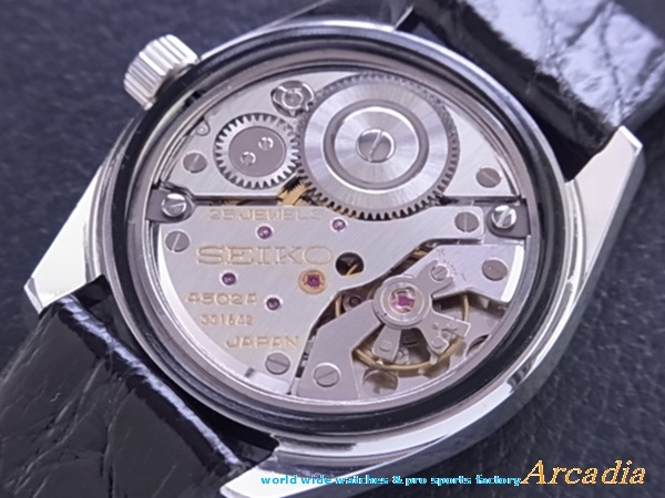 ◆1969年亀戸精工舎製、機械式「キングセイコーの最終型/手巻き10振動36000ビートクロノメーター基準規格合格品ムーブ搭載」、銀座和光オリジナル限定45KCM/C(現WAKOウオッチ)の逸品腕時計です◆ ●通常のKS45手巻きキングセイコー(文字盤にcronometer表記無し)の最終型には「cronometerムーブ」が搭載された大変レアな逸品があります。当時すでにクォーツへの過渡期であり、自動巻も普通に出回り、あまり売れずにムーブメントの在庫がだぶついた結果、通説「◎1969年以降の45キングセイコー」には、ランダムに「cronometerムーブ」が入れられてしまっているレア物があります。 ●本時計は、大変レアで貴重な「◎初期型の1969年製!」それも稀少固体の「シルバー鏡面SS初期7000側型/特殊縦3面クリアレックスカットガラス」4502A型キングセイコーの「デイト付セイコースタイル7000側」仕様と大変貴重な個体です。文字盤には、「cronometer」表記がありませんが、クロノメーターのムーブメントが搭載された逸品です。(通常号機45KSに対して、クロノメーター号機は45KCM/Cとなります)その違いは、「極細の秒針」と「◎ムーブメントの受板に打たれた6桁の個体番号(本時計331642ゴールド刻印有り)」にあります。本時計のムーブメント受板についている4502A刻印の下にある「個体番号331642(画像参照)」が45KCM/Cの特徴で通常の45KSにはこの刻印がありません。通常号機45KS製造ラインとは別ラインで組み立てられ入念に調整され検査の後、日本クロノメーター協会優秀級クロノメーター検定基準をクリアし出荷された最初期型の大変優れたクロノメータームーブメントを搭載した時計です♪ ◎本時計だけに採用されている貴重な「特殊縦3面クリアレックスカットガラス」は、可視光線透過率が高く明るくクリアな特別なガラスです。以後、1970年代中期以降に販売が開始された「最高級グランドクオーツ」等にも採用され始めた初期のクリアレックスカットガラスです。本時計はそれに先駆け装着された貴重な「特殊縦3面クリアレックスカットガラス」を使用した限定腕時計の逸品です♪ ◎また、本時計の初期型シルバー鏡面SS7000側は、後期型の7001側型よりラグが極太で貴重な仕様の腕時計となっております♪ ◎本時計の精度は、国産機械式腕時計の中でも「白眉」と言えます逸品です。また、「ニューシャテル天文台コンクール」の申し子的なムーブメントを搭載した腕時計です。 時計精度のコンクールとして当時の最高権威である、「スイス・ニューシャテル天文台コンクール・ジュネーブ天文台コンクール(当時オメガ他スイスメーカー多数参加)」で1960年代後期、上位独占を果たした精工舎は、その高技術力を活かして市販しておりました時計が本時計「45KCM/C(KS4502A)型」で「セイコーマイルストーン腕時計」です♪ 1969年亀戸精工舎製手巻式10振動36000ビート、カレンダー付き4502A。諏訪精工舎や亀戸精工舎が、スイスの天文台級精度コンクールで上位を独占し好成績を挙げた時代の最高傑作機械です。稀少な手巻きハイビートの10振動(36000振ハイビート)デイト付き/秒針停止機能付きモデルです。同じ25石ムーブメントで100万円超えで取引されることもある、「グランドセイコー45VFA」は、本時計のムーブメントがベースとなり作成されておりいかに本時計「KS4502A型ムーブ」が優れているかが覗われる名機です♪ ホワイトシルバー放射状文字盤/特殊縦3面クリアレックスカットガラスに高級感あふれる作りの凝ったシルバー/オニキスブラックアップライトインデックスが視認性が良く絶妙のバランスで配置され、12時位置のインデックスはダブルバーインデックスが施され、さらに「4500A型キングセイコーにはないデイト付き」の先鋭的フェイスで大変優れた素晴らしい腕時計です♪ ◎通常モデルの4502A搭載型キングセイコーは、ノンデイトモデル同様1968年10月から製造が開始されました「手巻き25石10振/36000毎時ハイビート/デイト/秒針停止機能付きモデル」です。精工舎内精度規格検定では「優秀級のクロノメータームーブメント」で、ある意味45キングは4420KSクロノメーター以上で、精度は手巻き機械式ムーブではセイコー史上過去最高の日差-2~+2秒(45VFA)というとてつもない精度を誇り、セイコーの歴史上、最高峰の手巻き機械であると言っても過言ではないと思われる大変素晴らしい腕時計です。日本の手巻き式腕時計の一つの完成形と思われます逸品です。 ●本時計モデルを最後に、セイコーの「手巻き式10振動36000ビート腕時計」はその使命を終えたとも言えるセイコーの歴史を物語る上で伝説化した「珠玉の逸品腕時計」です! 名機4420キングセイコークロノメーター獅子と比較しても機能/洗練されコンパクト化、高振動ムーブメントゆえの高精度/高信頼性、造形美においては、むしろ素晴らしい時計です。なによりも高精度/高級機種でありながら、実用性を意識した「デイト付き(ジャスト切り替え機能)」で最高のモデルです。また、限定手巻き4