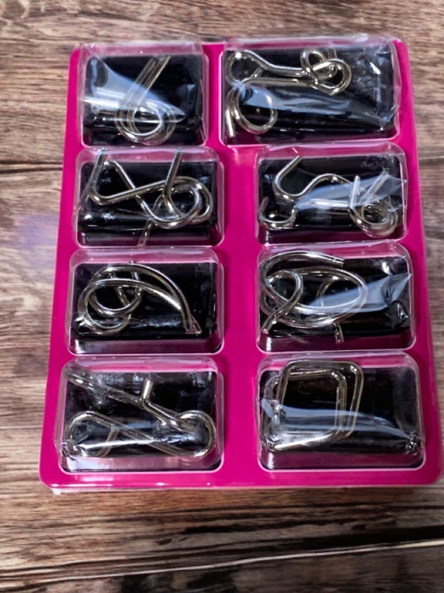 8種類の知恵の輪がセットになったパズルです。脳トレや暇つぶしに最適です。新品未使用品ですが、自宅保管のため、神経質な方はご遠慮ください。