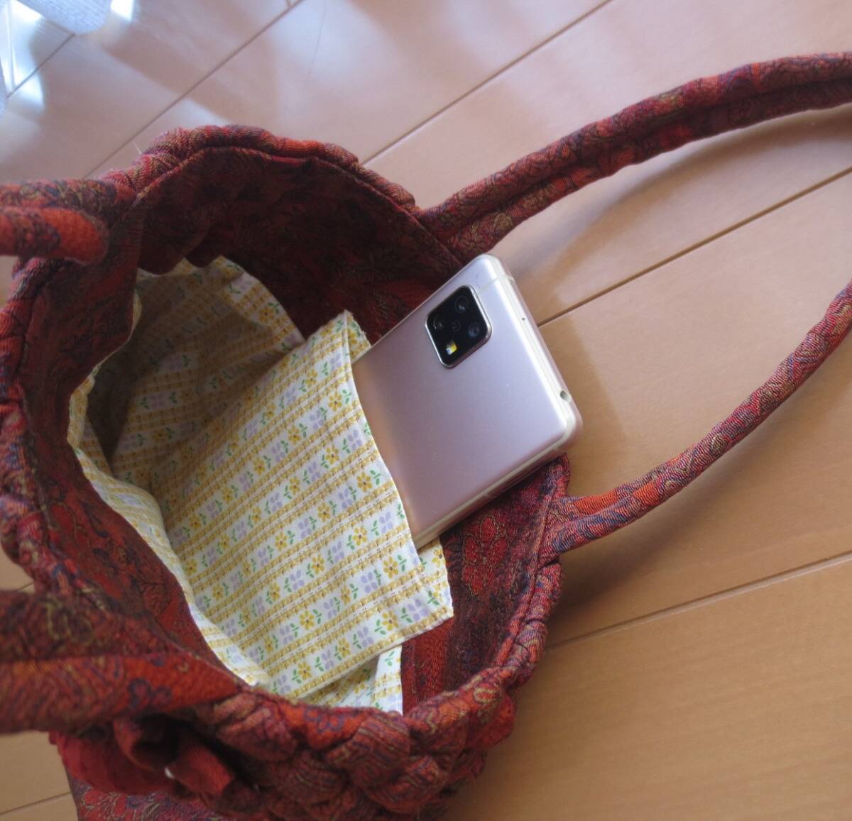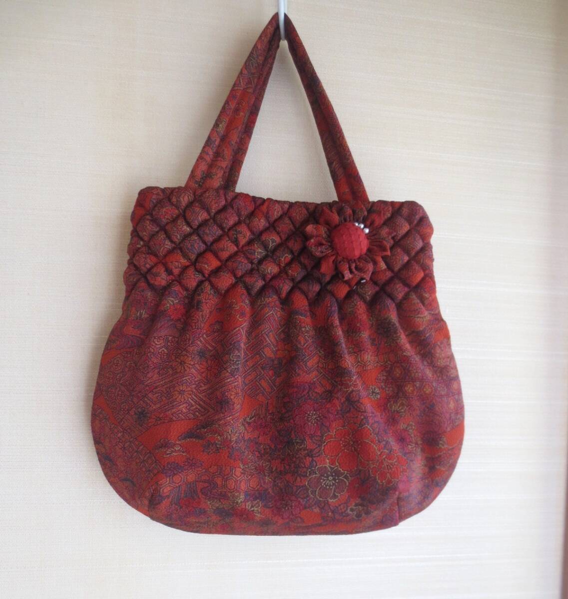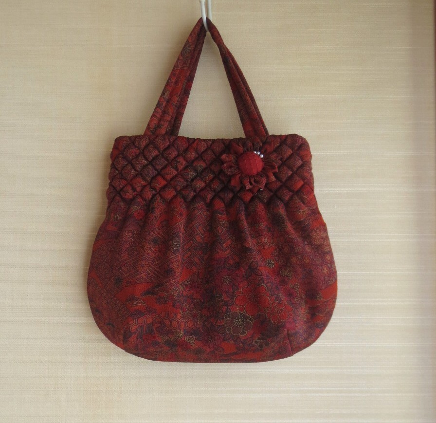おしゃれ手提げ 布花ブローチ付き 手提げ 着物リメイク ハンドメイドバッグ 赤系模様 プレゼントに