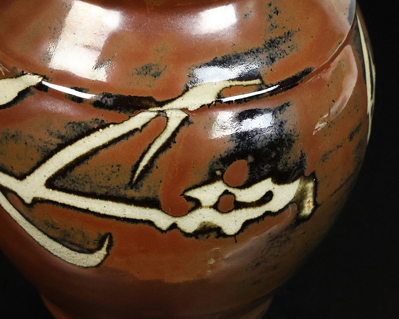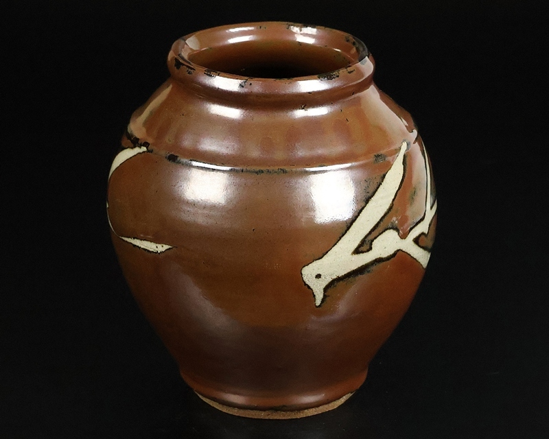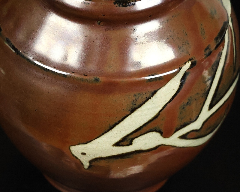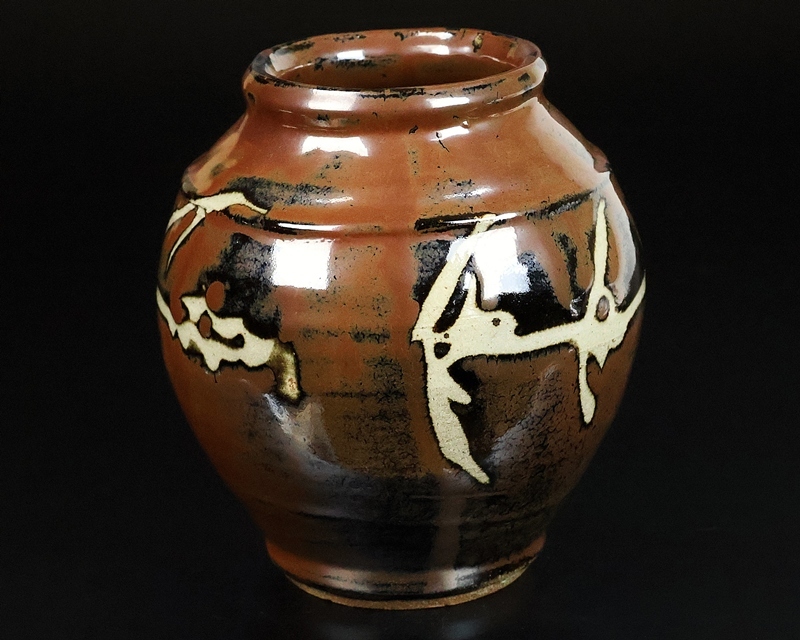 バランスの良い造形と、柿釉抜絵の技法でデザインされた作者の代表的図案「黍文」が作品に躍動感を添えた作品。
