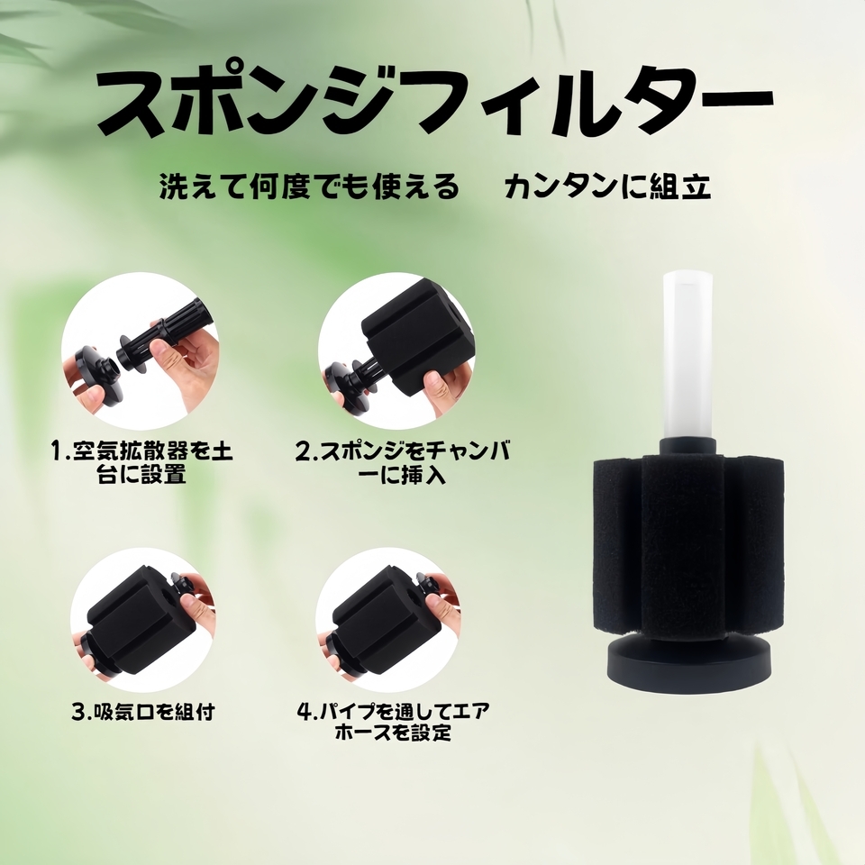 スポンジフィルターにより二重濾過(物理ろ過と生物濾過)、更にバクテリアに繁殖促進させ生物機能付きです。飼育容器をきれいで水質浄化抜群効果があります。