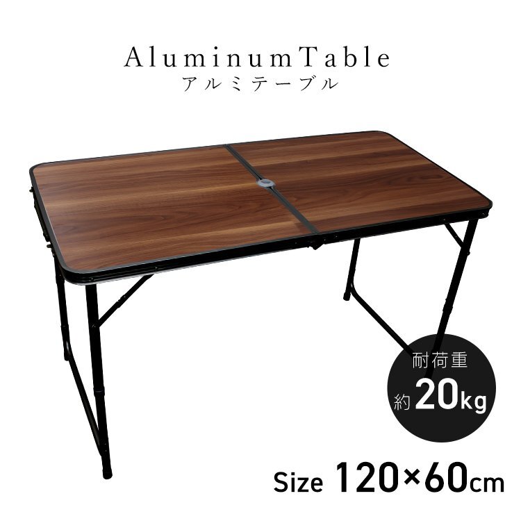 簡単組立の折りたたみアウトドアテーブルです。 コンパクトサイズの120cm×60cm! シチュエーションや好みに合わせて高さ調整が可能! 「ハイスタイル」「ミドルスタイル」「ロースタイル」の3段階です。 折りたたみ式&持ち手付で持ち運びもラクラク♪ 必要のない時は折りたたんで収納できる! 自然になじみやすい木目調デザインです。 キャンプやバーベキュー、ピクニック、お花見、運動会などで大活躍☆ 【商品仕様】 カラー:ダークウォルナット サイズ:(約)幅120×奥行60×高さ55~70cm 収納時サイズ:(約)60×60×6.5cm 材質:アルミニウム 重量:(約)4.7kg 耐荷重:(約)20kg 【セット内容】 テーブル本体、パラソル固定パーツ×1 【注意事項】 ・海外製品で簡易梱包での輸入の為風防に擦れや多少の小キズなどがある場合がございますが、 商品自体には問題ありませんのでご了承下さい。 ・仕様・デザインは改良のため予告なく変更することがあります。 商品コード:A61B010DWN |