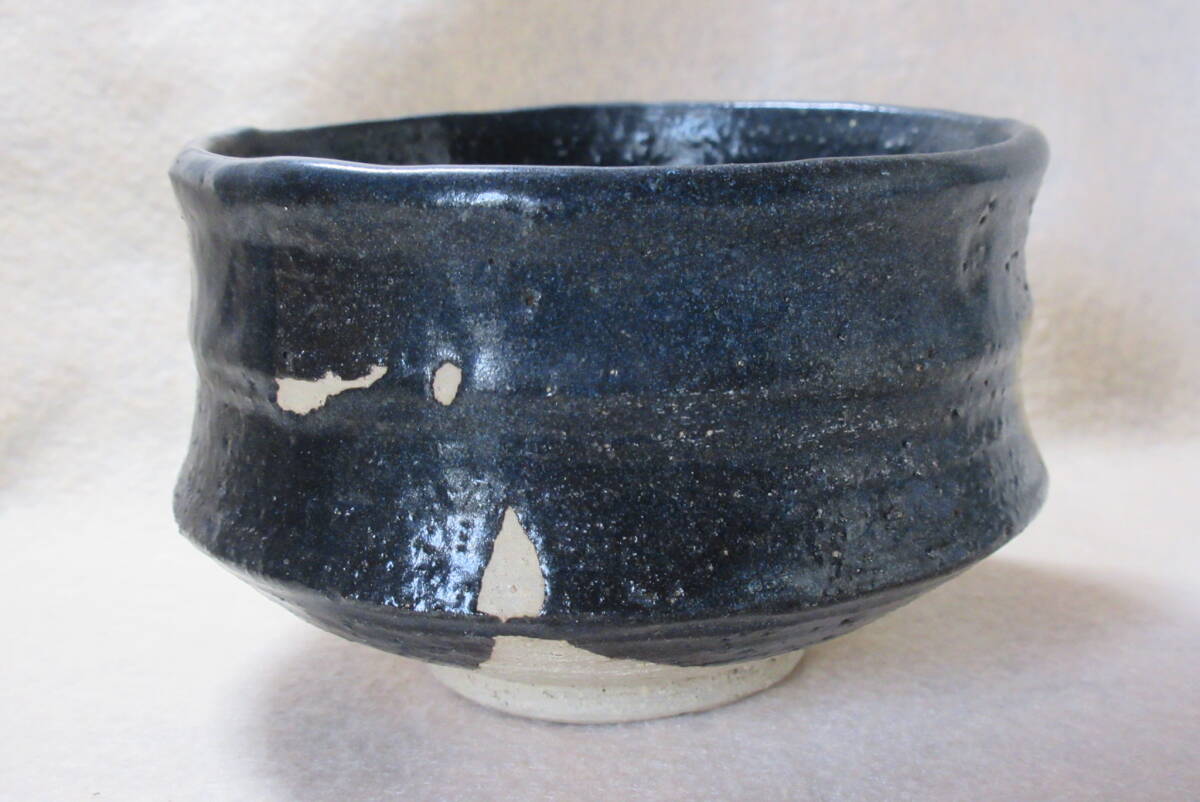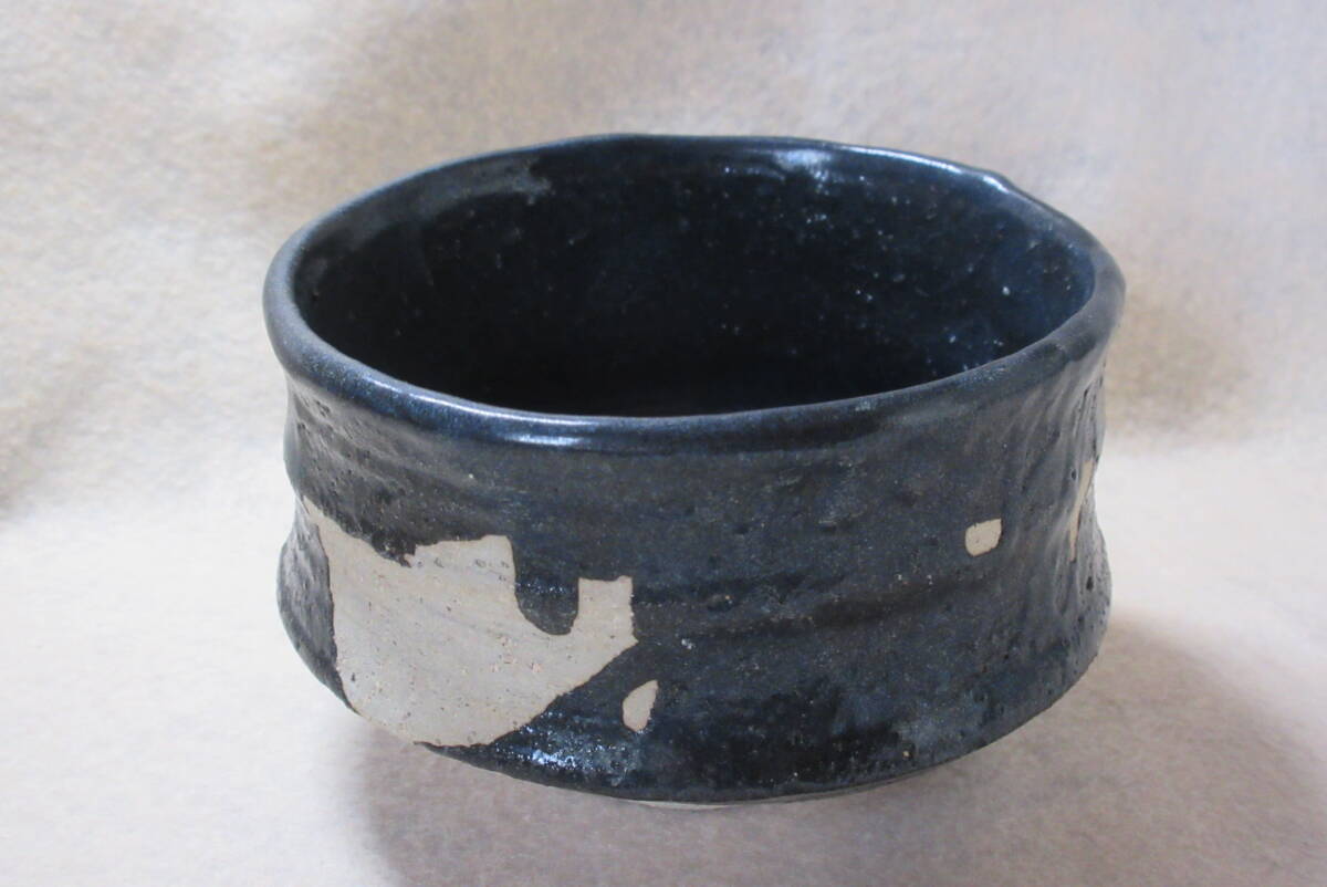 腰の張りの良い弱い沓形のやや小ぶりな織部黒の茶碗。
