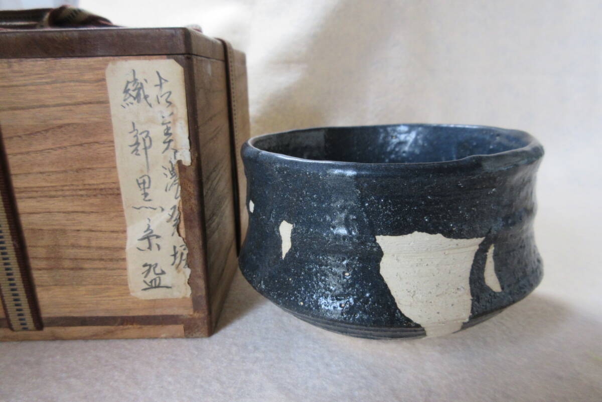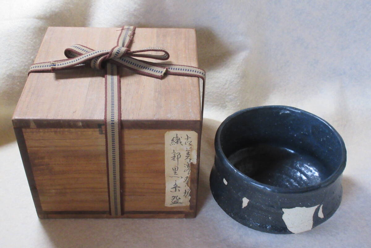 織部黒沓形茶碗 時代箱 発掘伝世品