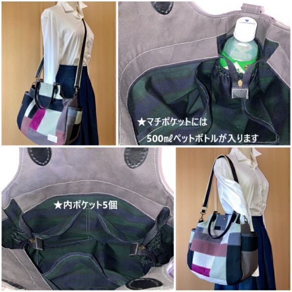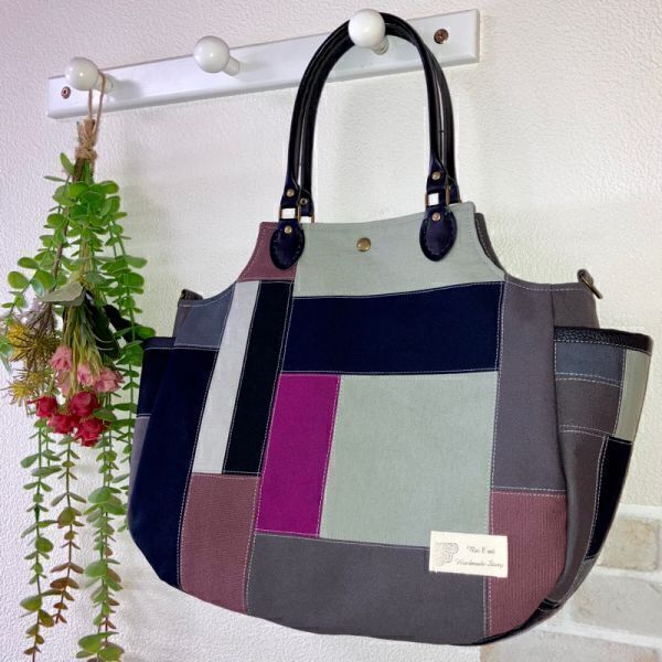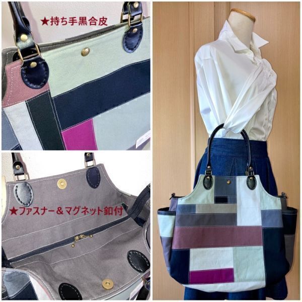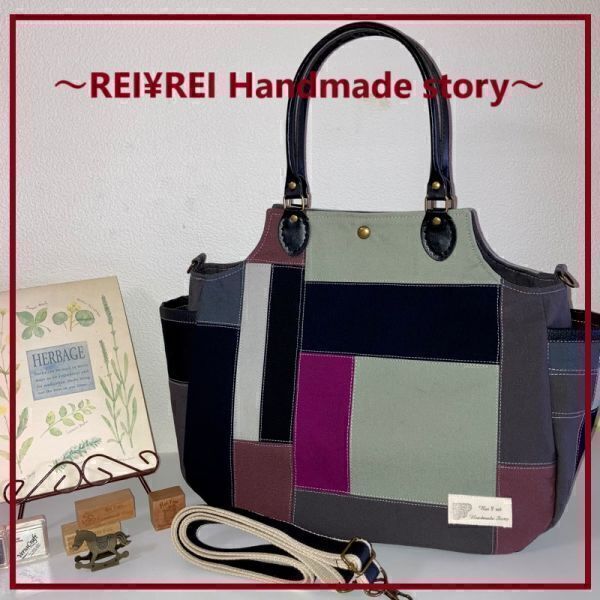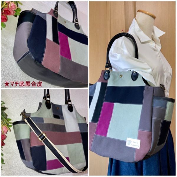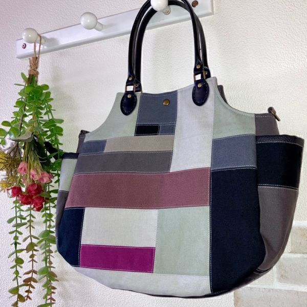 《 れい¥れいのハンドメイド生活 》 ◇ご覧いただきありがとうございます◇ ☆丸型トートバッグ☆4WAY☆ランダムパッチワーク☆帆布 シックな色合いの帆布のランダムパッチワークと 合皮の組み合わせの丸型トートバッグです 表マチ底に合皮を使用してますのでお手入れが簡単です ポケットいっぱいで内マチポケットにはペットボトルも入ります ファスナーとマグネット釦の2重開閉で 防犯面も安心です 横上部38㎝ たて中央32㎝ マチ底12㎝ 持ち手38㎝ 外ポケット2個 内ポケット5個 両開きファスナー&マグネット釦の2重開閉明き バッグ本体の重さ約390g ★斜め掛けショルダー紐付き 《 素材 》 ☆表パッチワーク地 綿100%(帆布) ☆内布 綿100% ☆表マチ底・持ち手・その他 合皮(黒) 《 お支払い方法 》