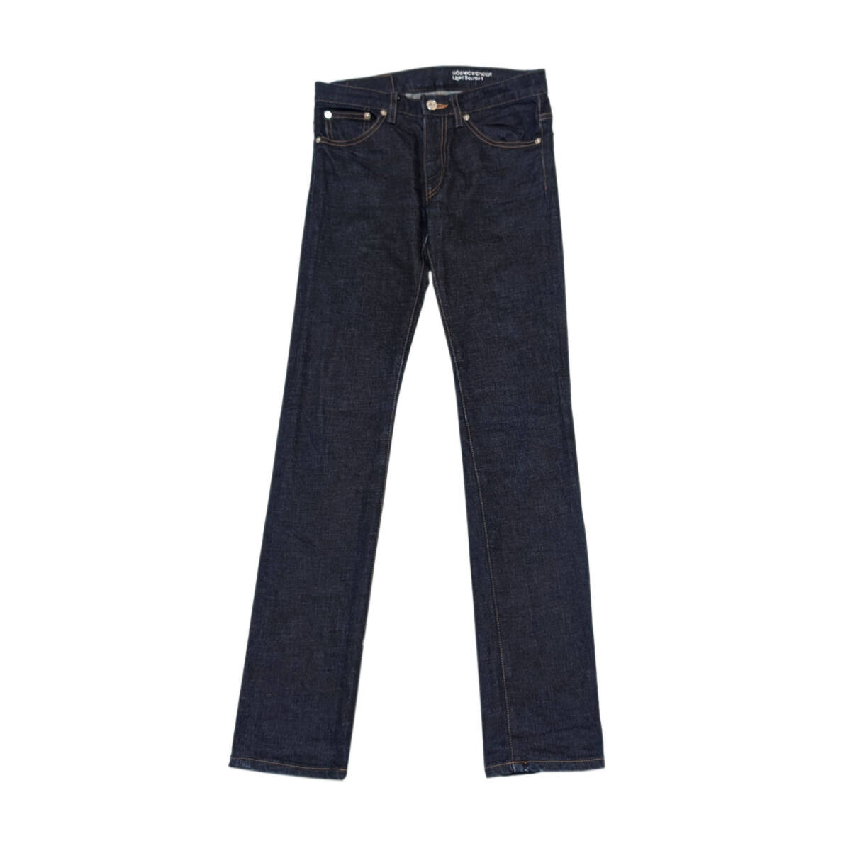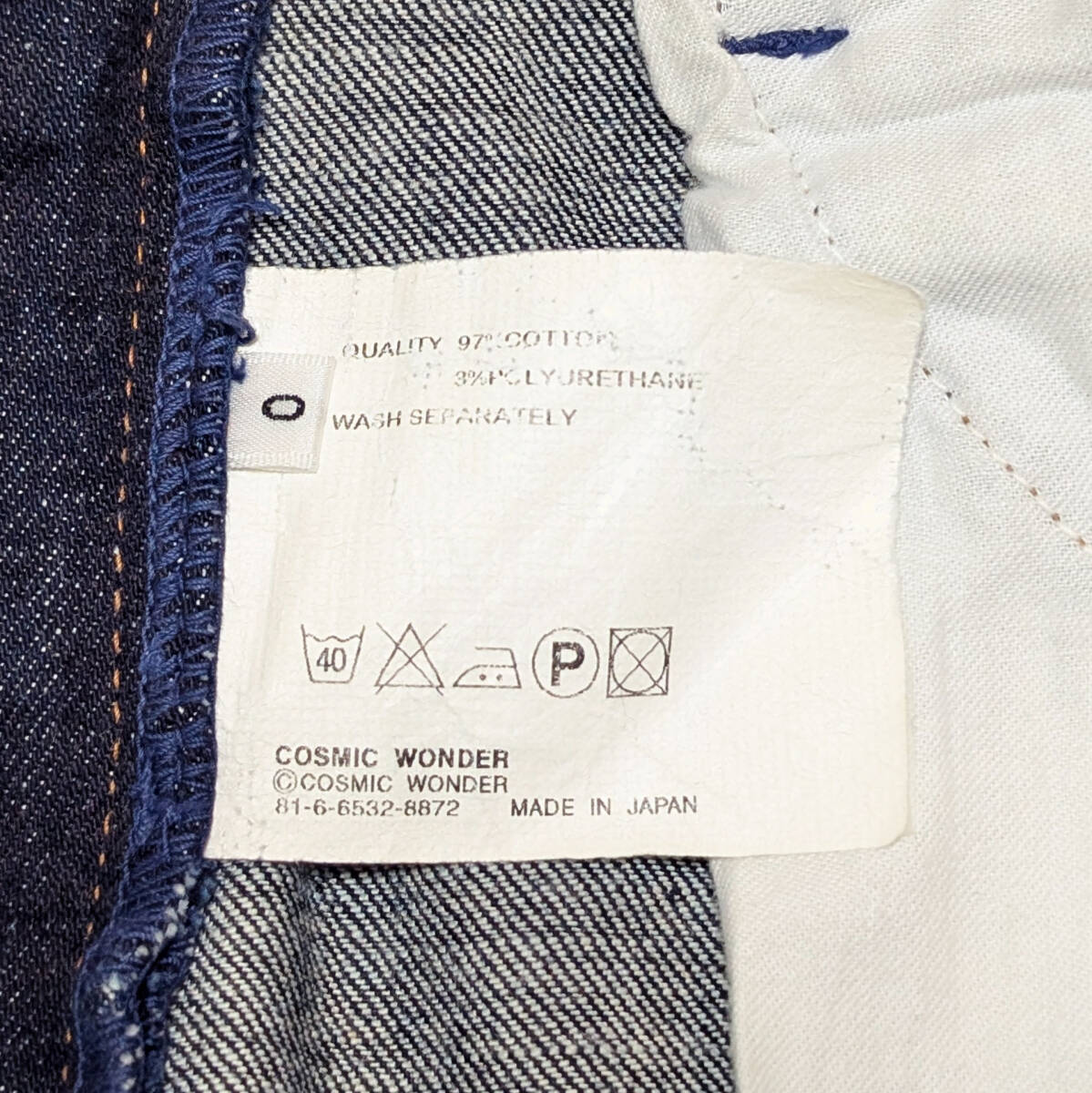 仕事の都合で発送まで最大1週間かかります。事前にご了承ください。コズミックワンダーのデニムパンツ。ストレッチデニムになります。ユニセックス向け、実寸をご確認ください。裾はオリジナルの丈のまま、チェーンステッチ仕上げです。ほとんど色落ちがなく、これから色落ちを楽しめる状態です。かなりミニマルなデザインです。日本製、ジップフライ、サイズ表記0、素材表記コットン97%・ポリウレタン3%。若干着用感ありますが、ダメージやヨゴレのないとても良い状態です。送料はこちらで負担します。正規品ですので、ご安心ください。ご不明な点はお気軽にご質問ください。