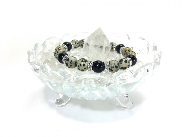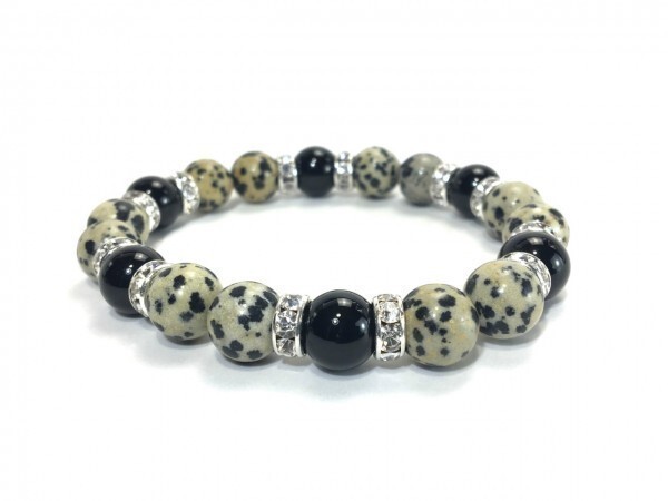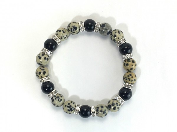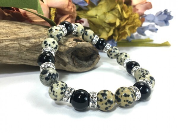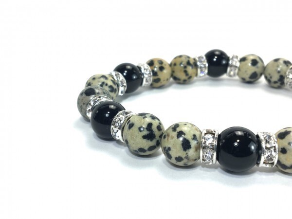 こちらは、ダルメシアンジャスパーとオニキスを組み合わせたブレスレットです。間にはロンデルを挟み高級感あるデザインに仕上がっています。石大きさは腕にも馴染みやすいように10mm玉で内径約18cm(伸可能)です。数に限りがございますので気になる方はお早めにどうぞ。サイズ調節も可能ですのでサイズ調節の場合は取引ナビにてご一報くださいませ。(サイズ調節無料です)