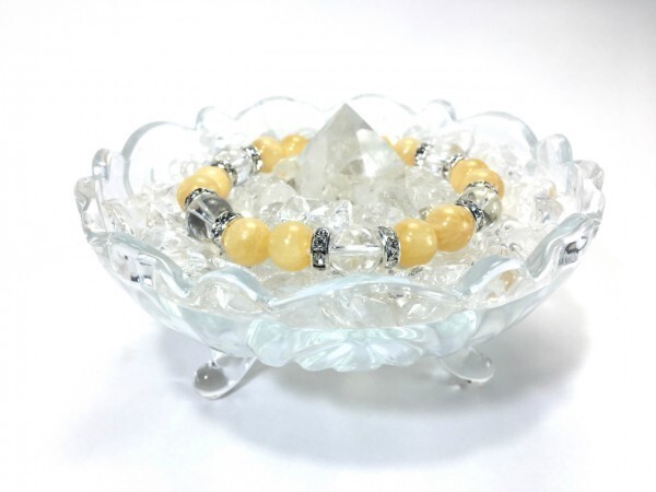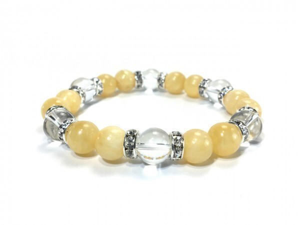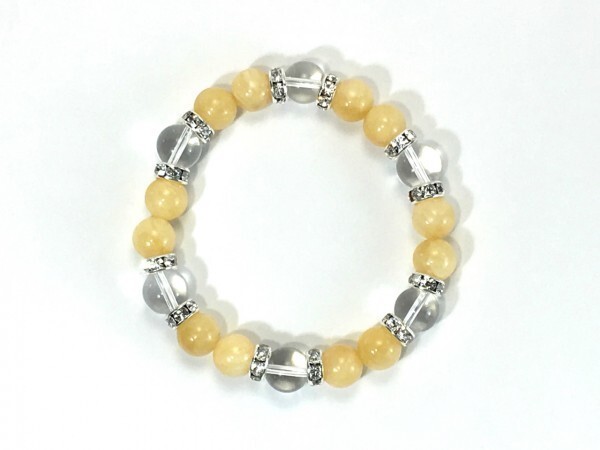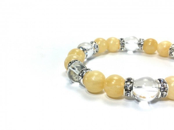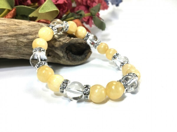 こちらは、アラゴナイトと水晶を組み合わせたブレスレットです。間にはロンデルを挟み高級感あるデザインに仕上がっています。石大きさは腕にも馴染みやすいように10mm玉で内径約18cm(伸可能)です。数に限りがございますので気になる方はお早めにどうぞ。サイズ調節も可能ですのでサイズ調節の場合は取引ナビにてご一報くださいませ。(サイズ調節無料です)