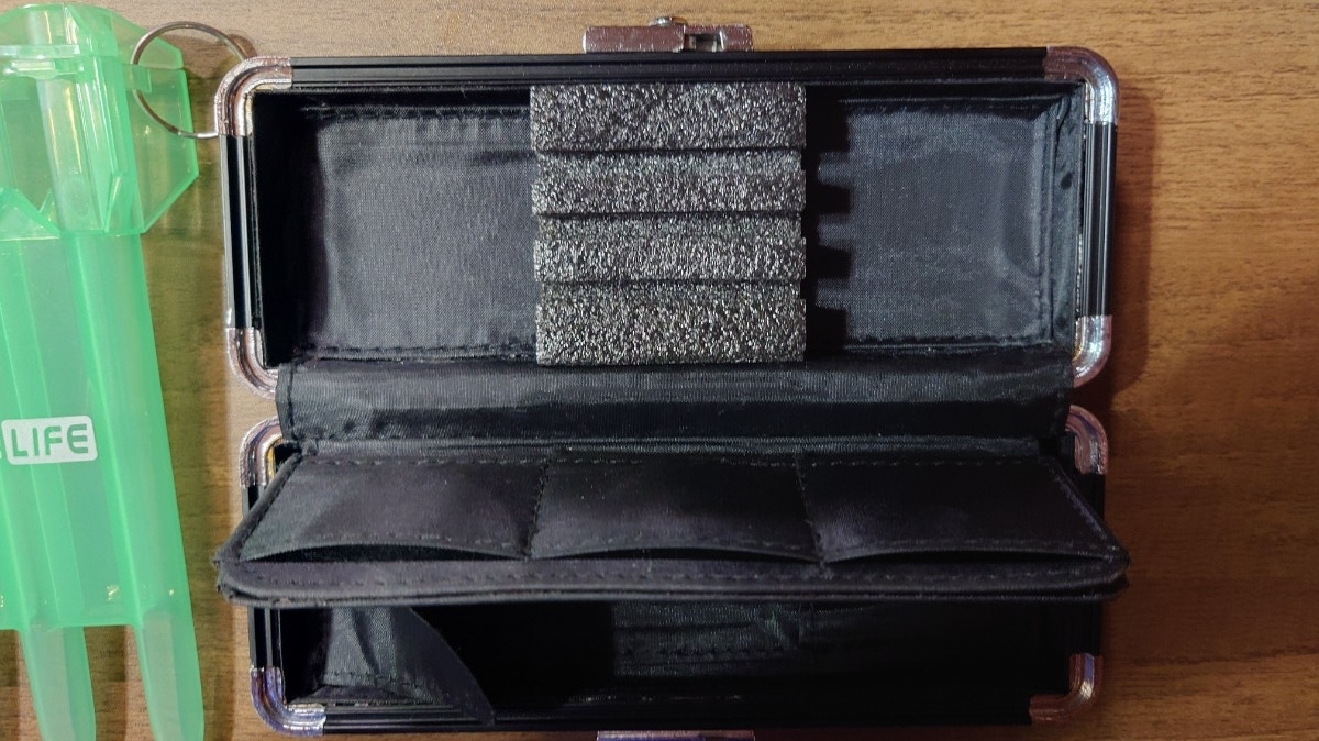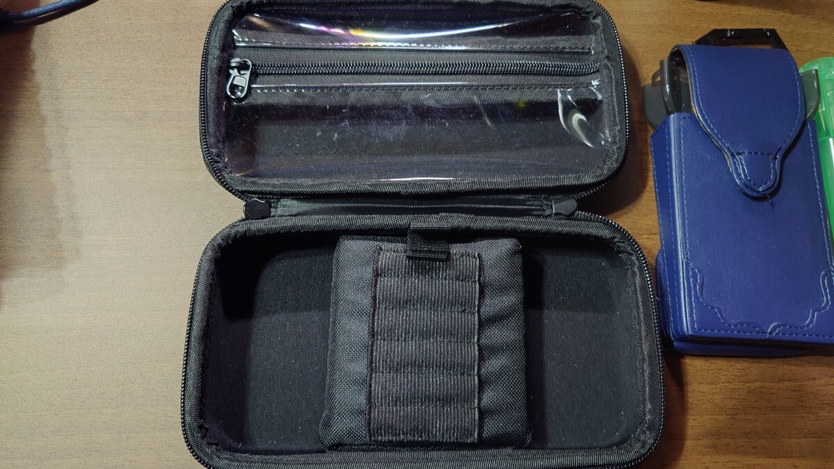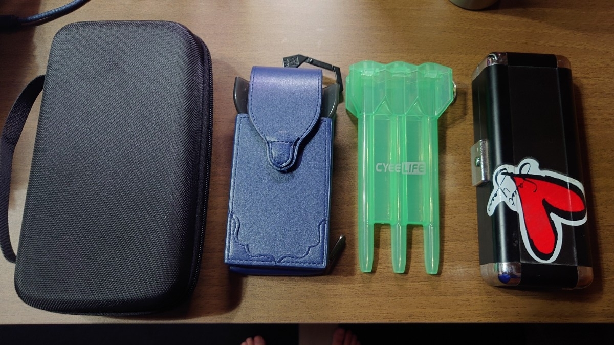 右の黒色のハードケースは1セット収納可、フライトは紙しか収納できませんが、最大で7つポケットがあります。