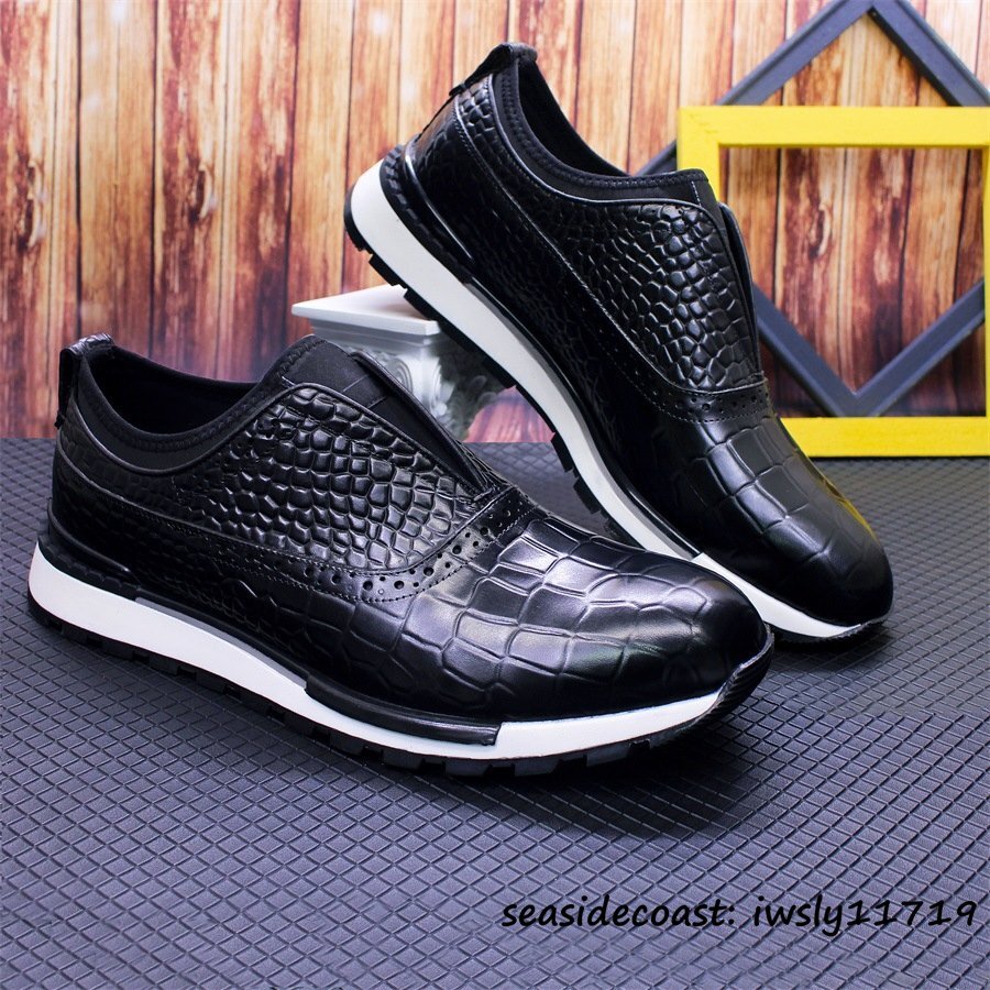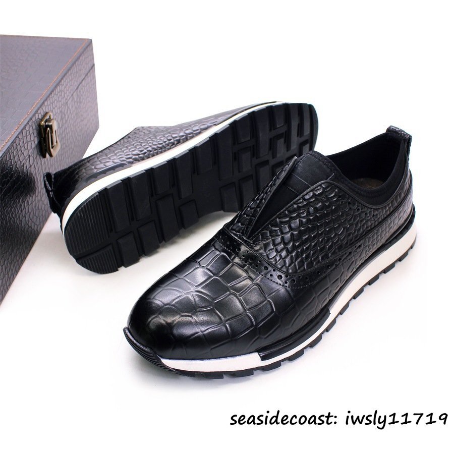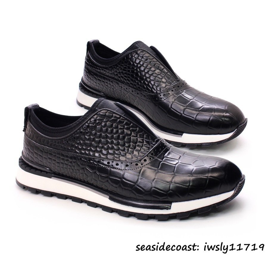 定価9万*最高級 スニーカー メンズ スリッポン 本革 レザーシューズ 鰐柄 牛革 ローファー 紳士靴 ビジネスシューズ 革靴 ブラック 26.0cm