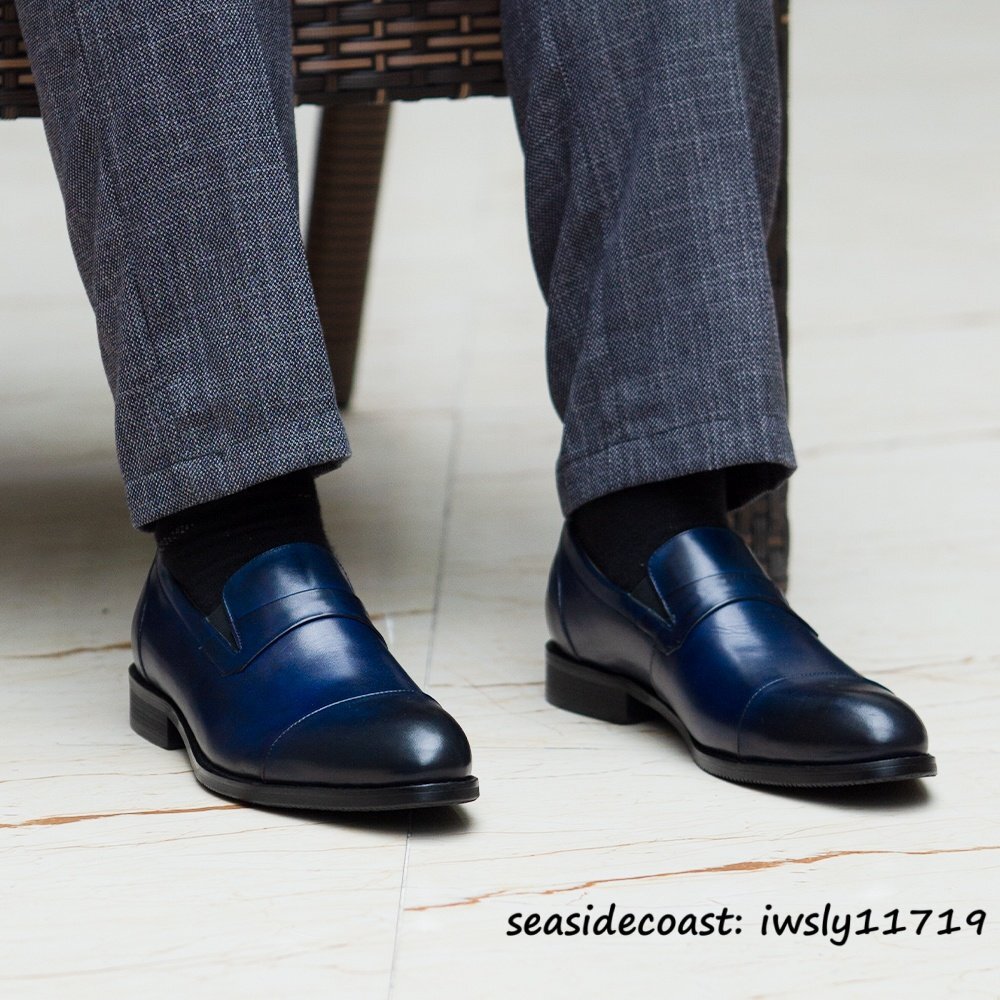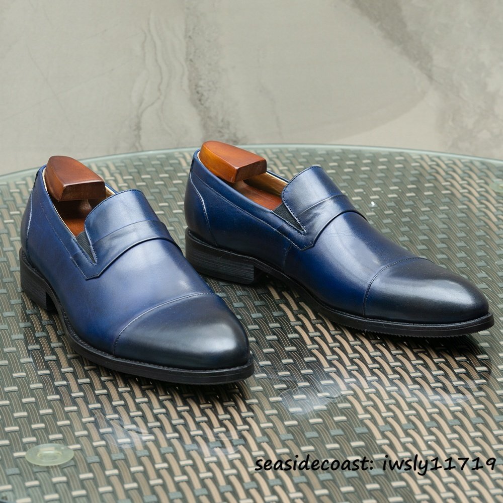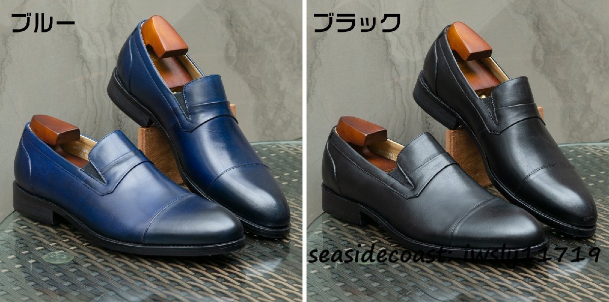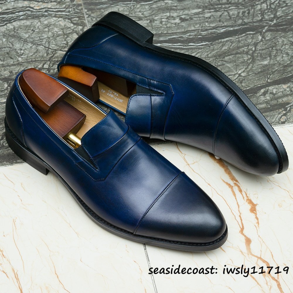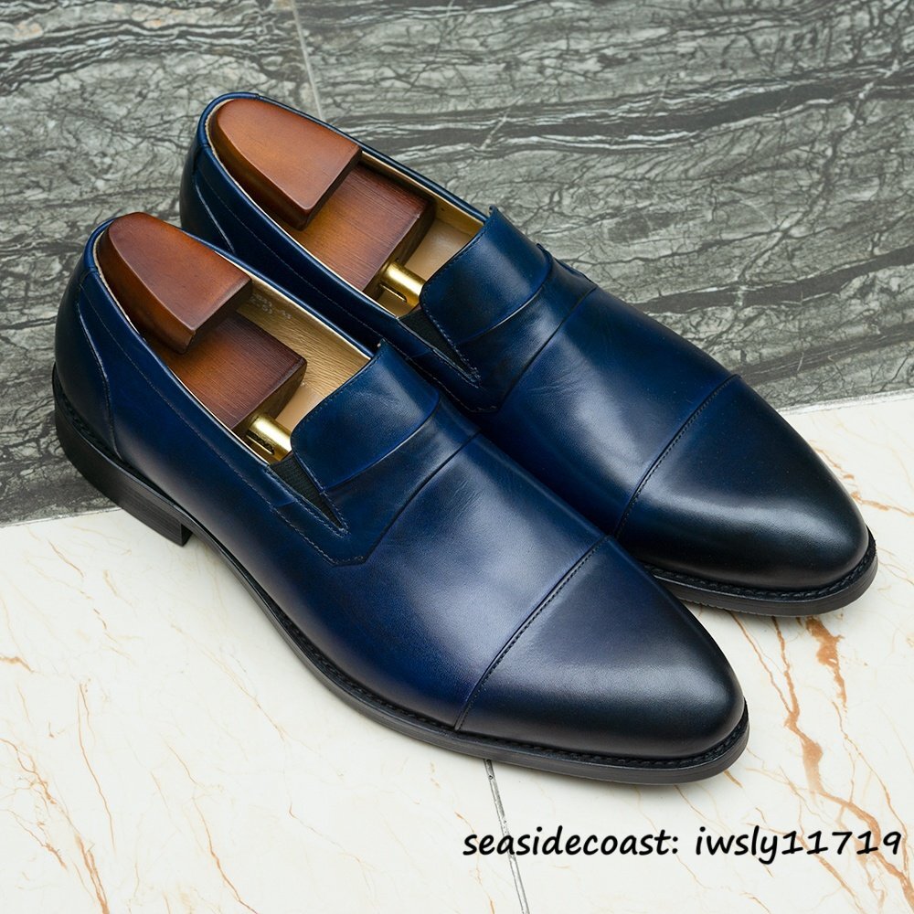超希少■メンズ レザーシューズ 本革 ローファー 職人手作り ビジネスシューズ 革靴 紳士靴 高級牛革 スリッポン 冠婚葬祭 ブルー 27.0cm