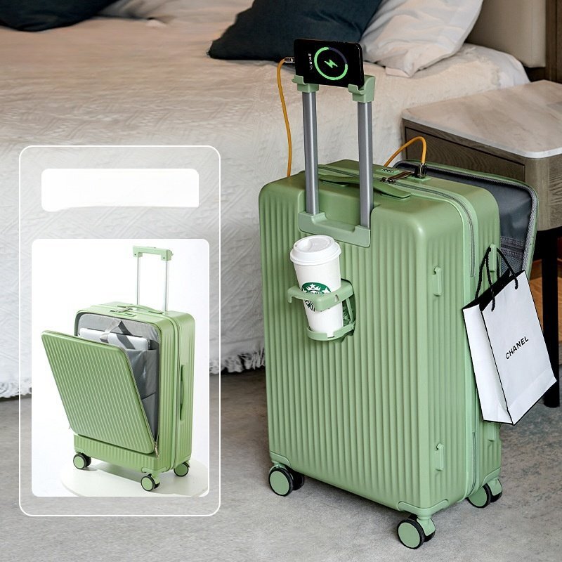 スーツケース キャリーケース 多機能 小型 usbポート/カップホルダー付き 軽量 静音 軽い 短期出張 旅行 22inch グリーン