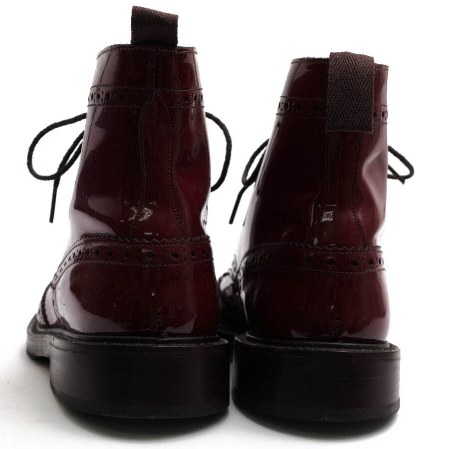 | ◆ブランド名 Tricker's ◆サイズ表記 UK7 ◆日本サイズ参考 約25.5-26.0cm ◆サイズ詳細 アウトソール靴底全長 約30cm、アウトソール靴底幅 約11.5cm、ヒール高さ 約3cm、ブーツ高さ 約17.5cm ◆特徴 ダブルソール カントリーブーツ ウイングチップ ウイングチップ ダイナイトソール ◆型番 M2508 MALTON Brogue Boots モールトン ◆生産国 イギリス ◆素材 上質な革 パテントレザー ◆素材詳細 牛革 ◆色 レッドブラウン 赤茶 ◆商品状態 中古品-良い ◆状態詳細 全体的に状態良好なお品ですが、表面パテントレザーにべたつきがみられます。また左足横部分に小さなキズ跡があります(画像1参照)あらかじめ、ご了承ください。 ◆付属品 保存箱(破損あり)、クロス |