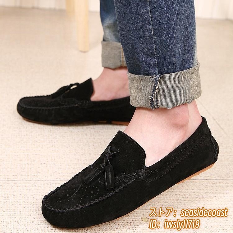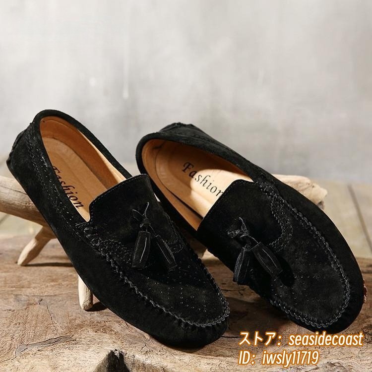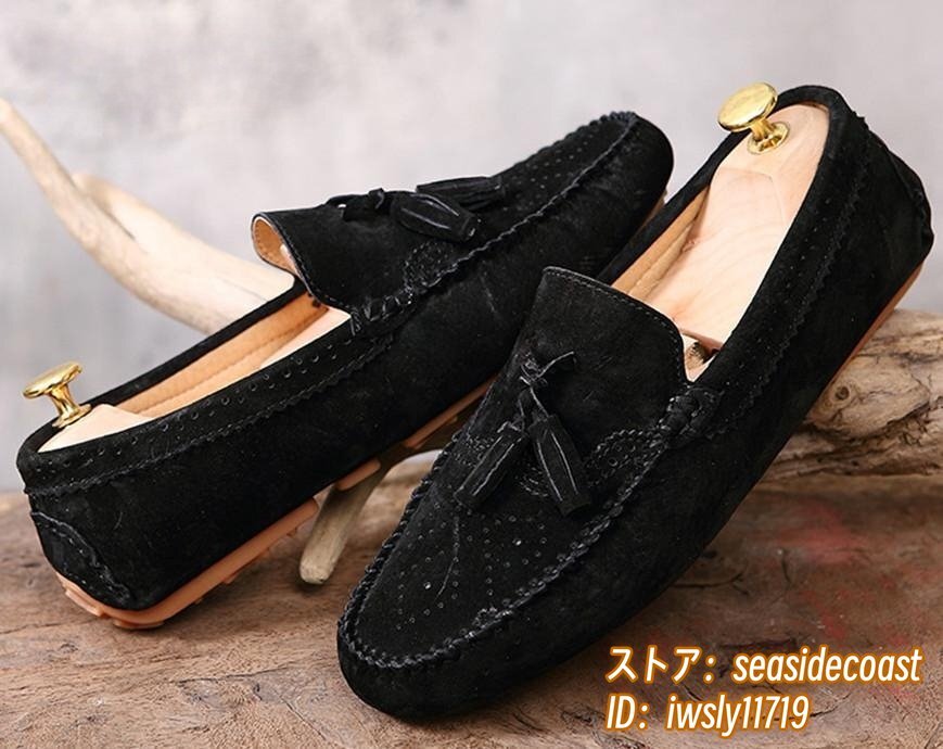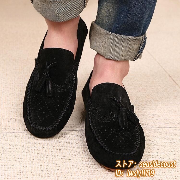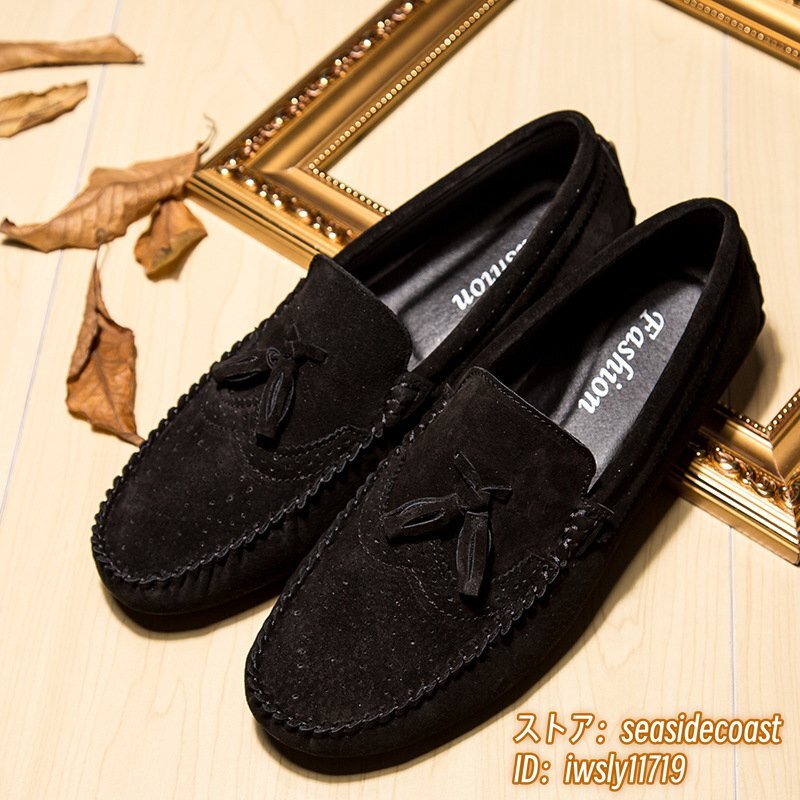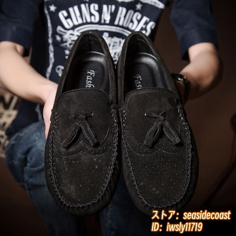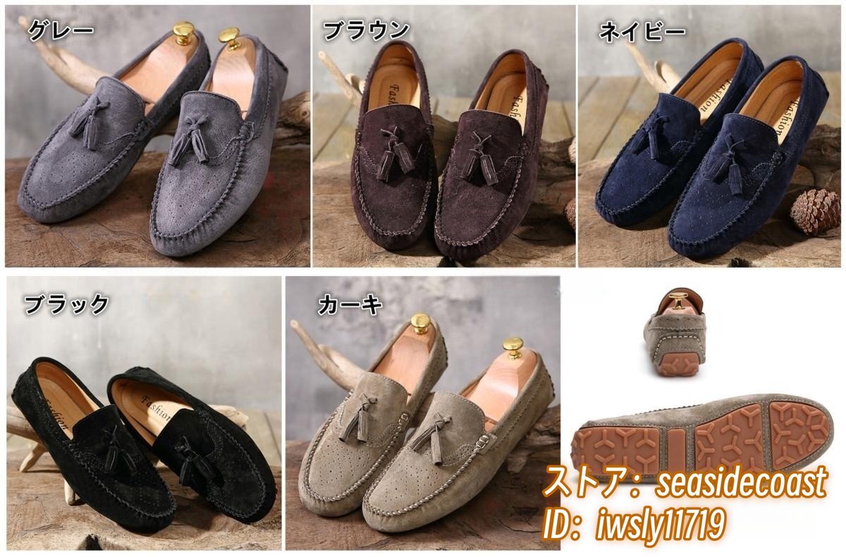 新品特売■ローファー スリッポン メンズシューズ 牛革 ドライビングシューズ 本革 スエード革 BROGUE タッセル 通気 五色 ブラック 25.0cm