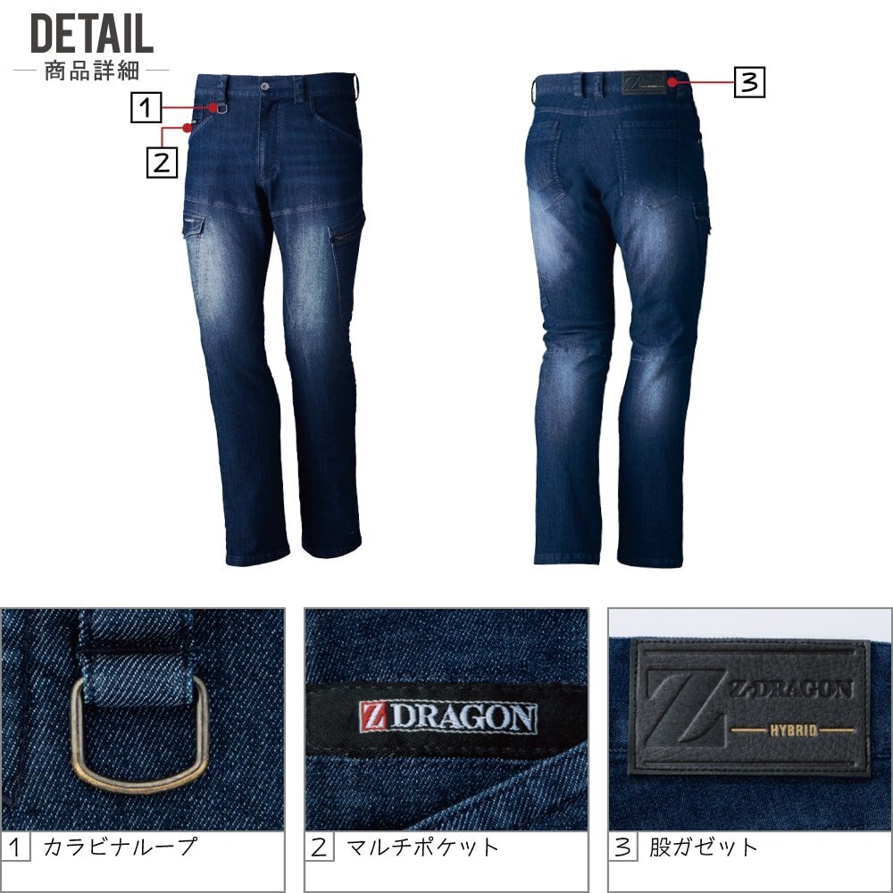 Z-DRAGON ジィードラゴン 秋冬 ストレッチ ノータック カーゴパンツ 伸縮性に優れたデニム素材 75602 色:インディゴ サイズ:85