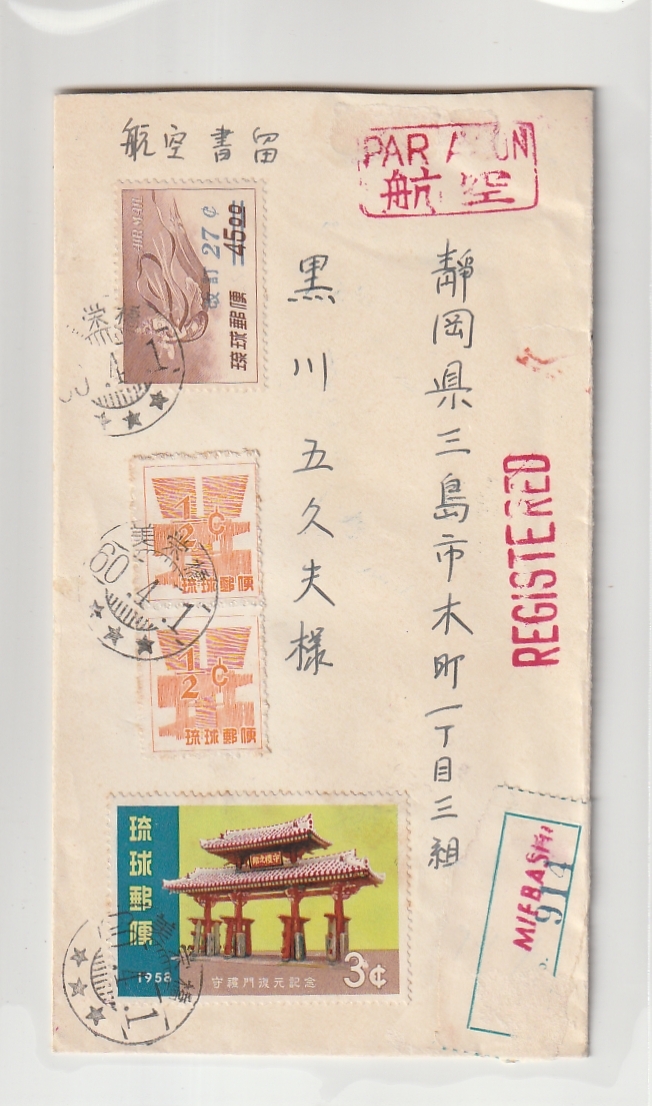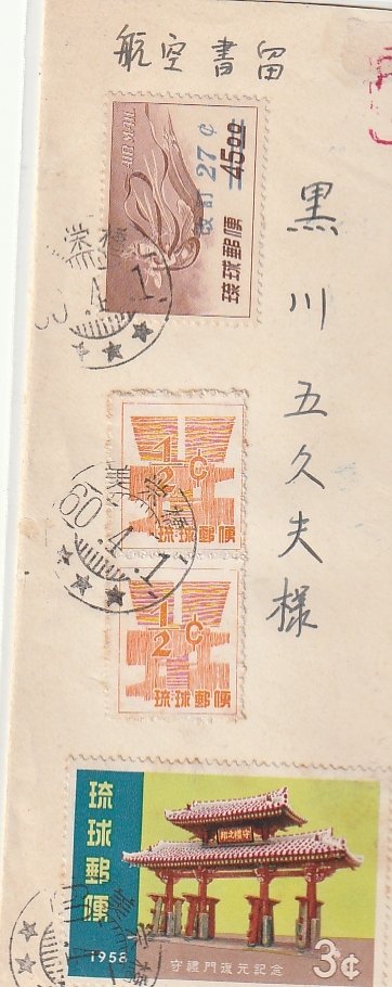 ◆琉球エンタイア◆天女航空加刷27c ドル表示数字0.5c 守礼門復元 櫛型C欄三ツ星 美栄橋