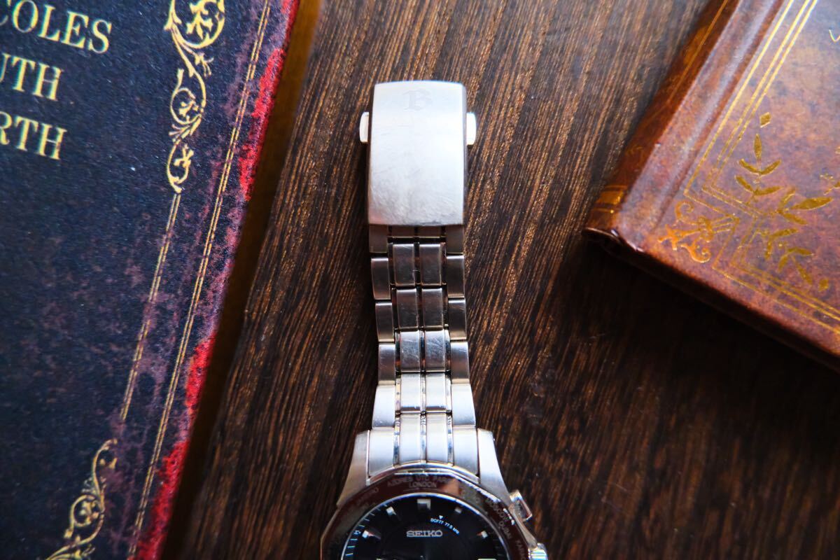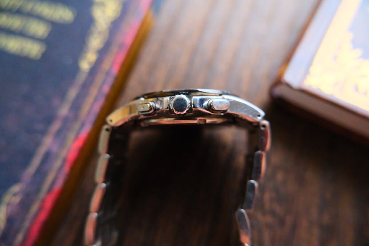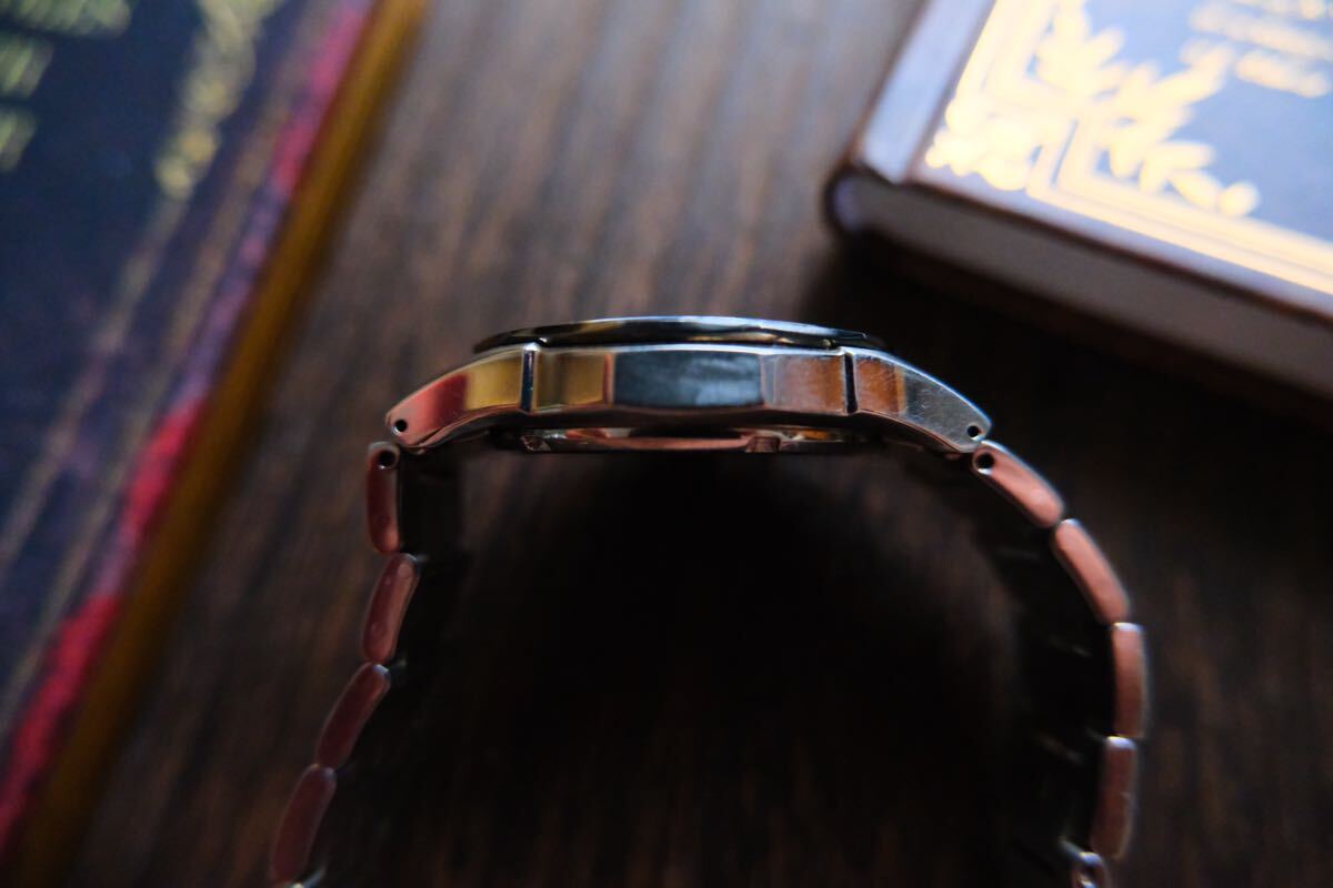 ケース、裏蓋、バンドに使用に伴ううっすらとした傷が複数あり、12時側のバンドのコマ部分からバックル表面辺りの傷がやや多めですが、風防のサファイアガラスには肉眼ではっきりとわかるような傷は見当たりませんでした。