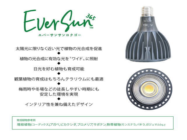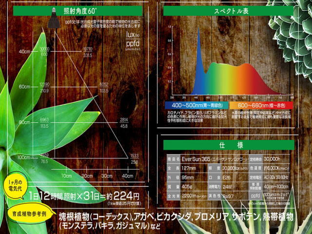 | 商品名:Ever Sun365 エバーサンサンロクゴー 室内で植物が育つLED!365日いつもお部屋に太陽を。 太陽光に限りなく近い光で植物の光合成を促進 植物の光合成に有効な光をワイドに照射 日光を好む植物も育成可能 観葉植物の育成はもちろんテラリウムにも最適 梅雨時や冬場などの徒長しやすい時期にも安心した環境を実現 インテリア性を兼ね備えたデザイン ■育成植物参考例 塊根植物(コーデックス)、アガベ、ビカクシダ、ブロメリア、サボテン、 熱帯植物、モンステラ、パキラ、ガジュマル、など ■商品仕様 全長:127mm 外径:直径95mm 質量:405g 全光速:2,200lmルーメン 照度:30,000luxルクス 口金:E26 消費電力:24W 演色性:Ra97 定格寿命:30,000h 色温度:約6,000kケルビン 定格電圧:AC100V 50/60Hz 推奨照射距離:約40cm~100cm 1ケ月の電気代:1日12時間照射x31日=約224円 ppfd:600umol m-2 s-1光合成光量子速密度 |