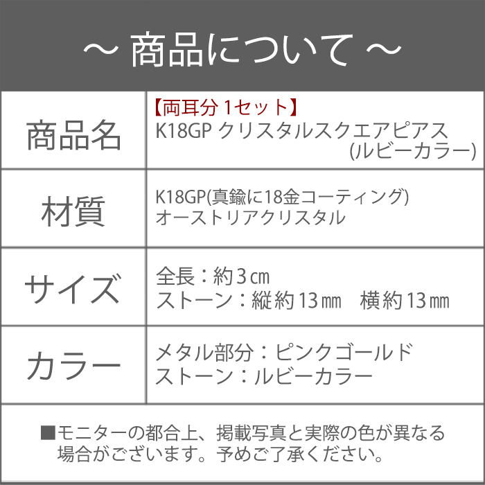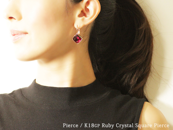 新品/ピアス/K18GP/ルビー/クリスタル/18金/ピンクゴールド/女性/レディース/両耳/リング/四角/スクエア/カラーストーン/大ぶり