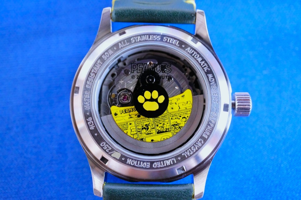 ムーブメントのローターにはスヌーピーのコミック(漫画)が印刷されています。