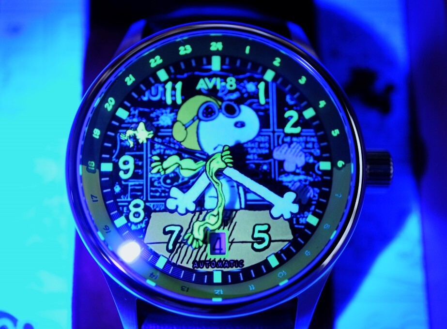ダイヤルにあるフライイング エース(戦闘機乗り)に扮したスヌーピーの