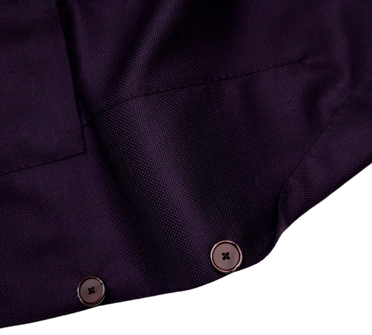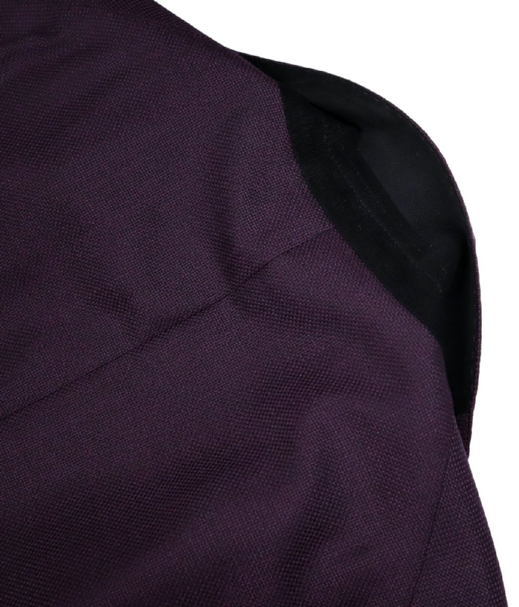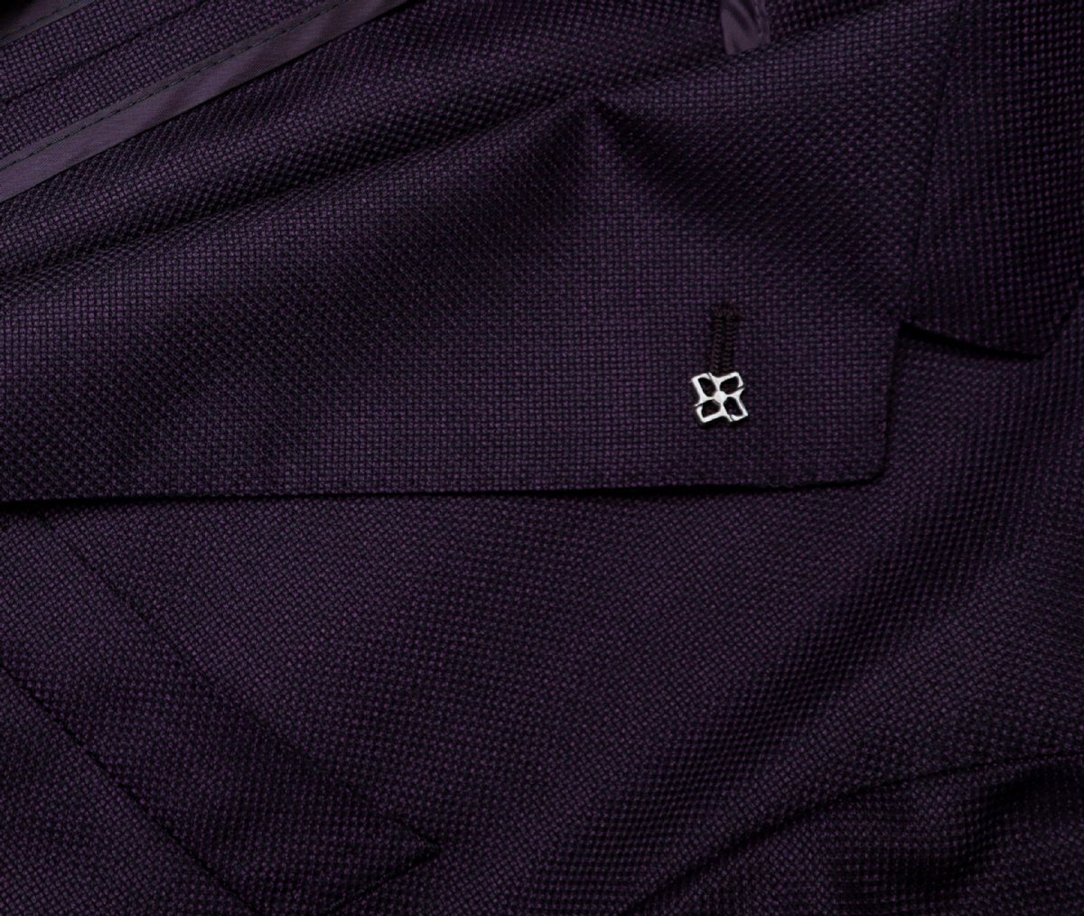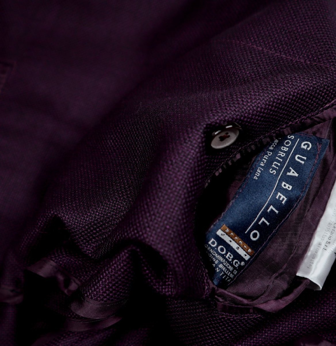 パープル色とブラック色の糸から構成された、”カリスマパープル” と言っていいほど、美しく色気ある深めのパープル色。イタリアの名門『 GUABELLO / グアベロ 』社のホップサック調の高級ウール素材を使用し、艶感もそのへんのジャケットとは違うラグジュアリー感が出ています。通気性がよく、ハリとコシが強く、シワにもなりにくいので、ビジネス使いもしやすい。襟裏はブラック色の細畝コーデュロイ素材になっており、襟立てもカッコいい。本水牛を同色に染色したデザインボタンも上質感があり、生地やボタンにこだわる「タリアトーレ」ならではです。ラペルにはお馴染みのデザインラペルピンが付属します。