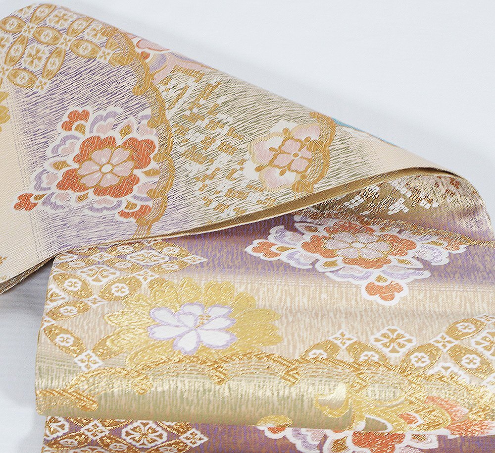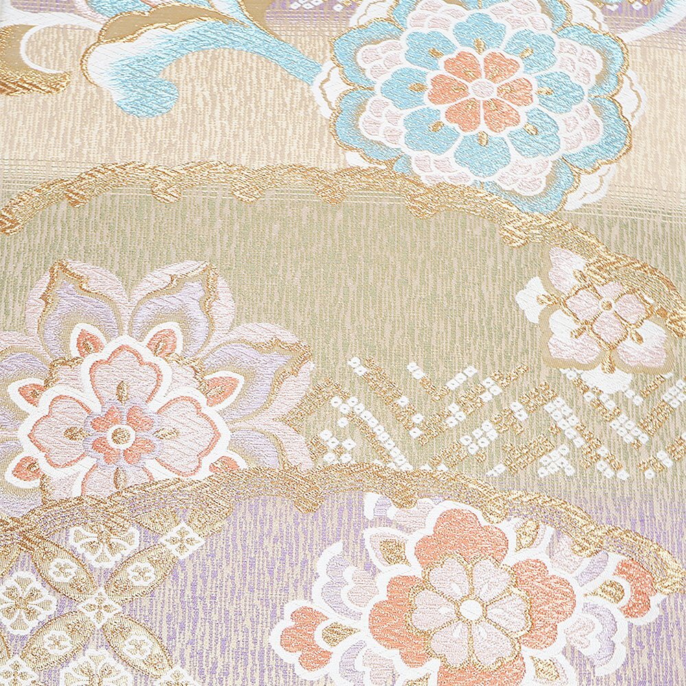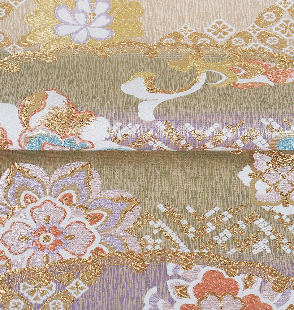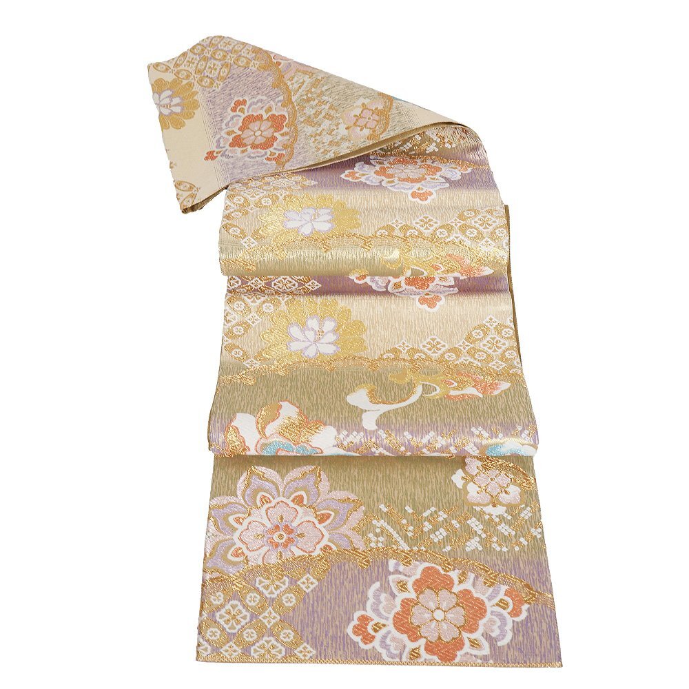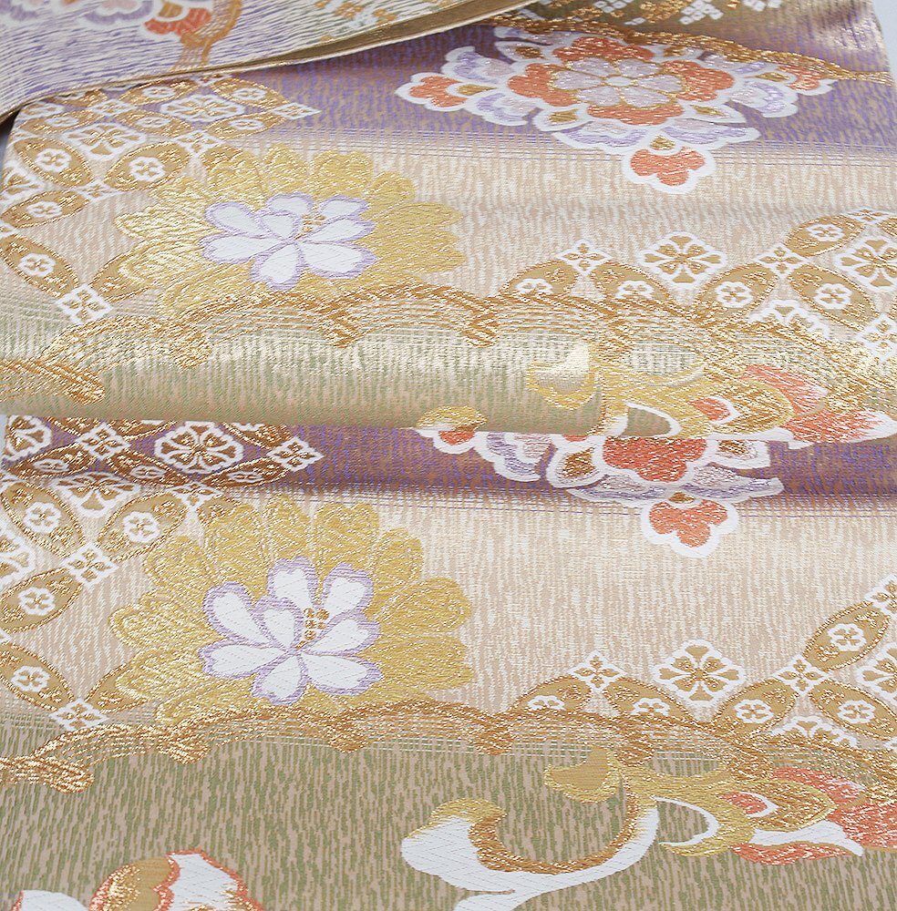 | 西陣織袋帯 金・緑・紫・グリーン・レンガ色地 唐花・華文・七宝文 未使用品 仕立て上がり |