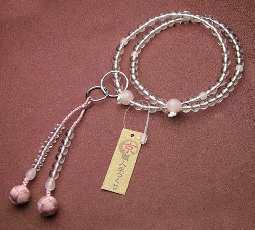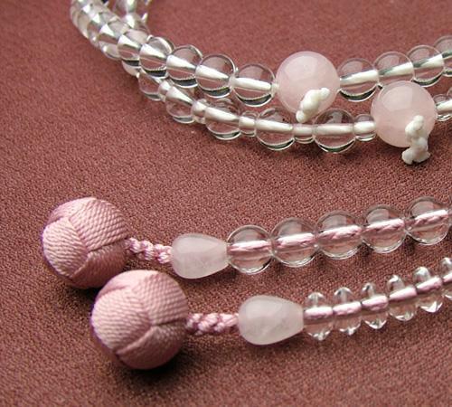 ・親珠、四天珠、つゆ珠がローズクウォーツで、透明な水晶は気品があり、全体的にやさしく清楚な雰囲気があります。
