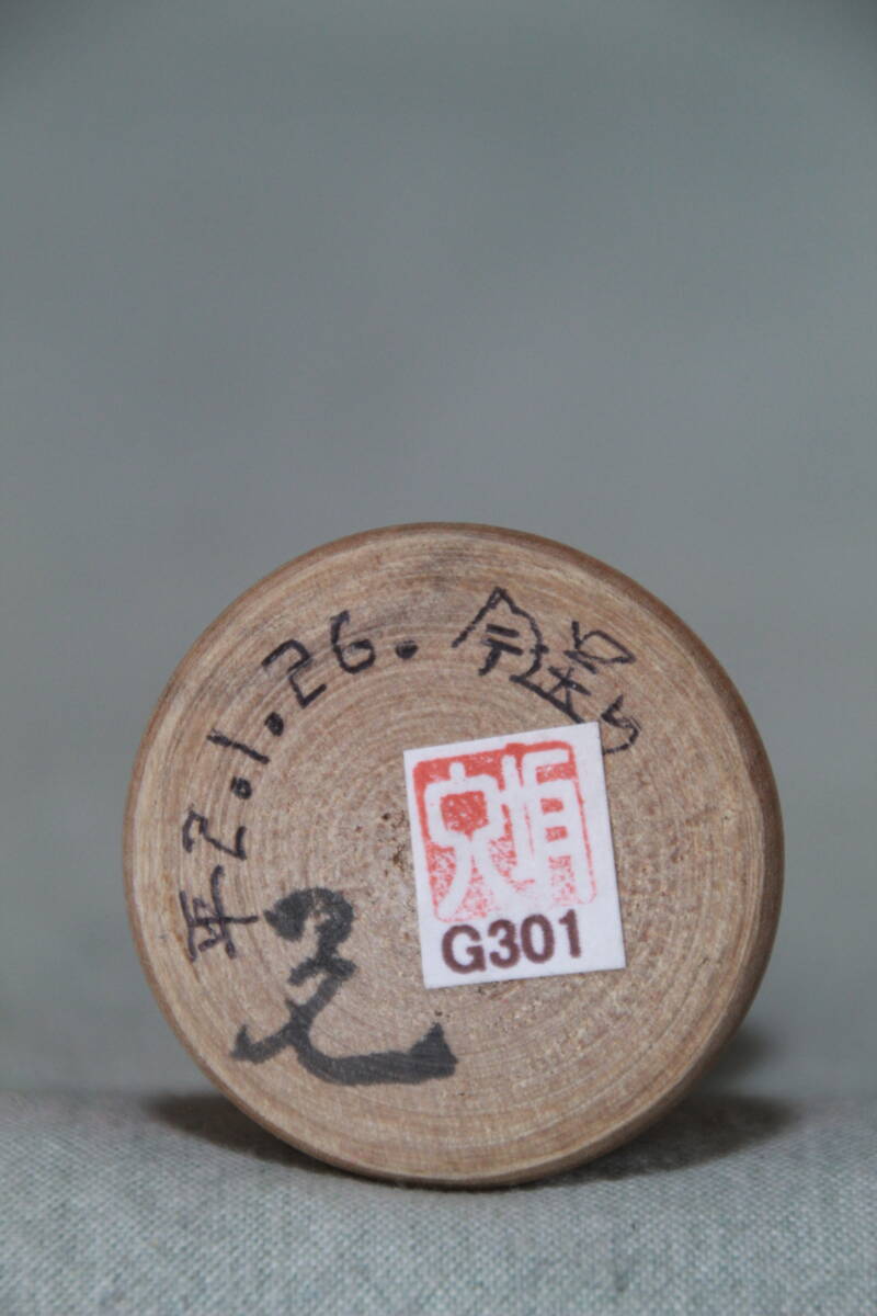 ・今晃さん作の8cm、平成2126日、山谷多兵衛型ロクロ線模様、G301」(丸い頭から太胴は絞り良い小寸に。ロクロ線は感じ良く。黒髪は勢いに、眉太長に、瞼も大きく。大きい瞳の多兵衛型の変化は明るい。)です。