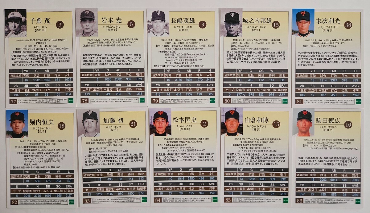 2010年エポック 巨人レギュラー10枚セット 長嶋茂雄、堀内恒夫、加藤初、山倉和博、駒田徳広など ジャイアンツ