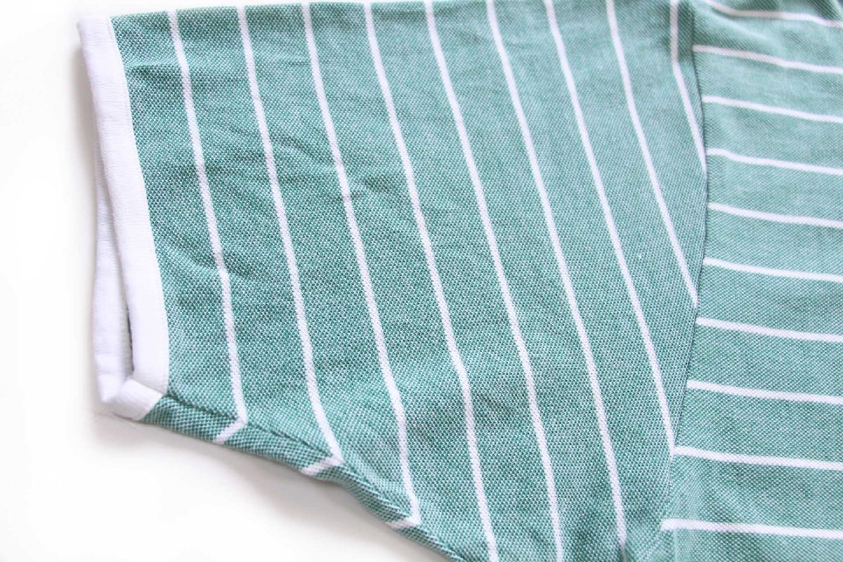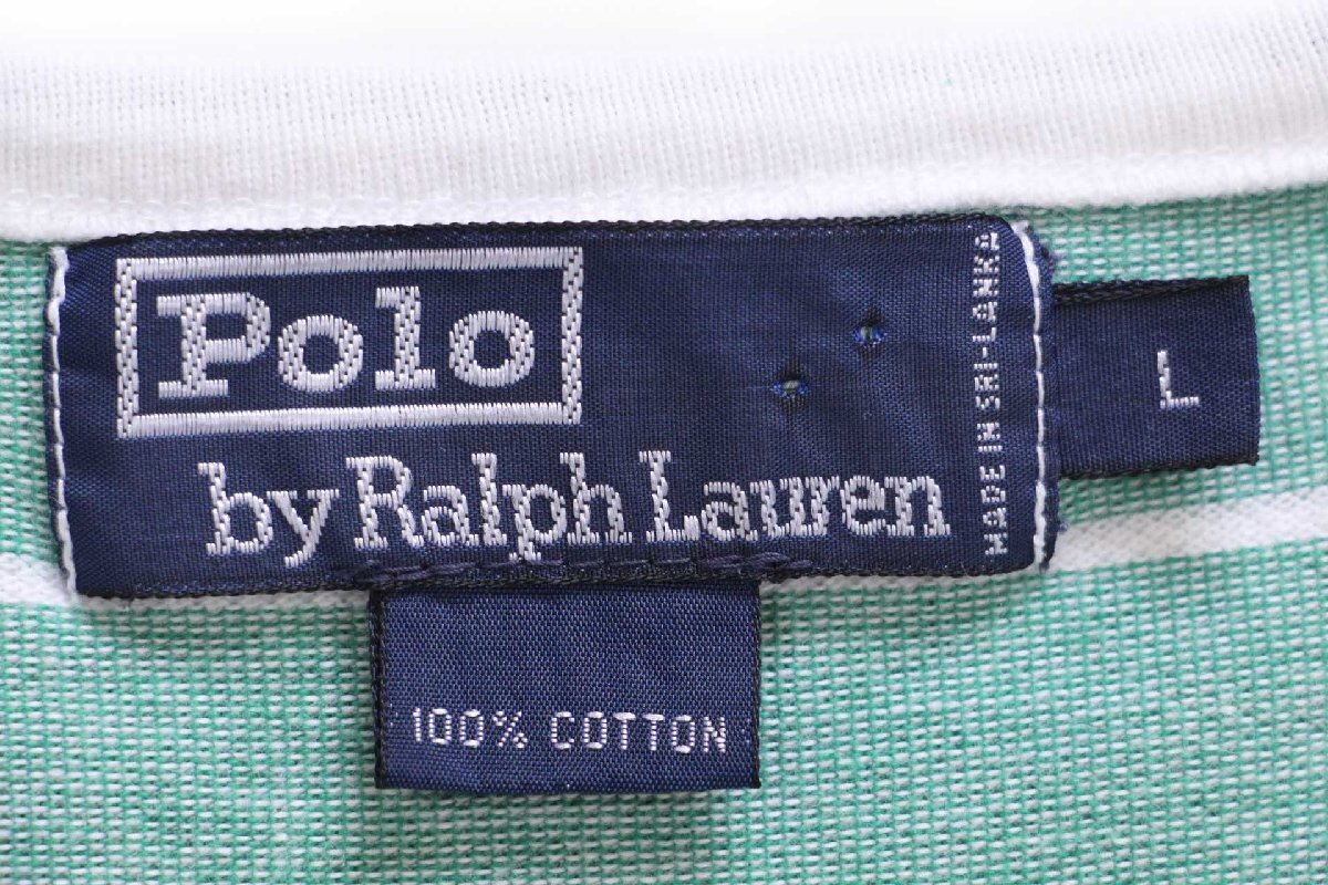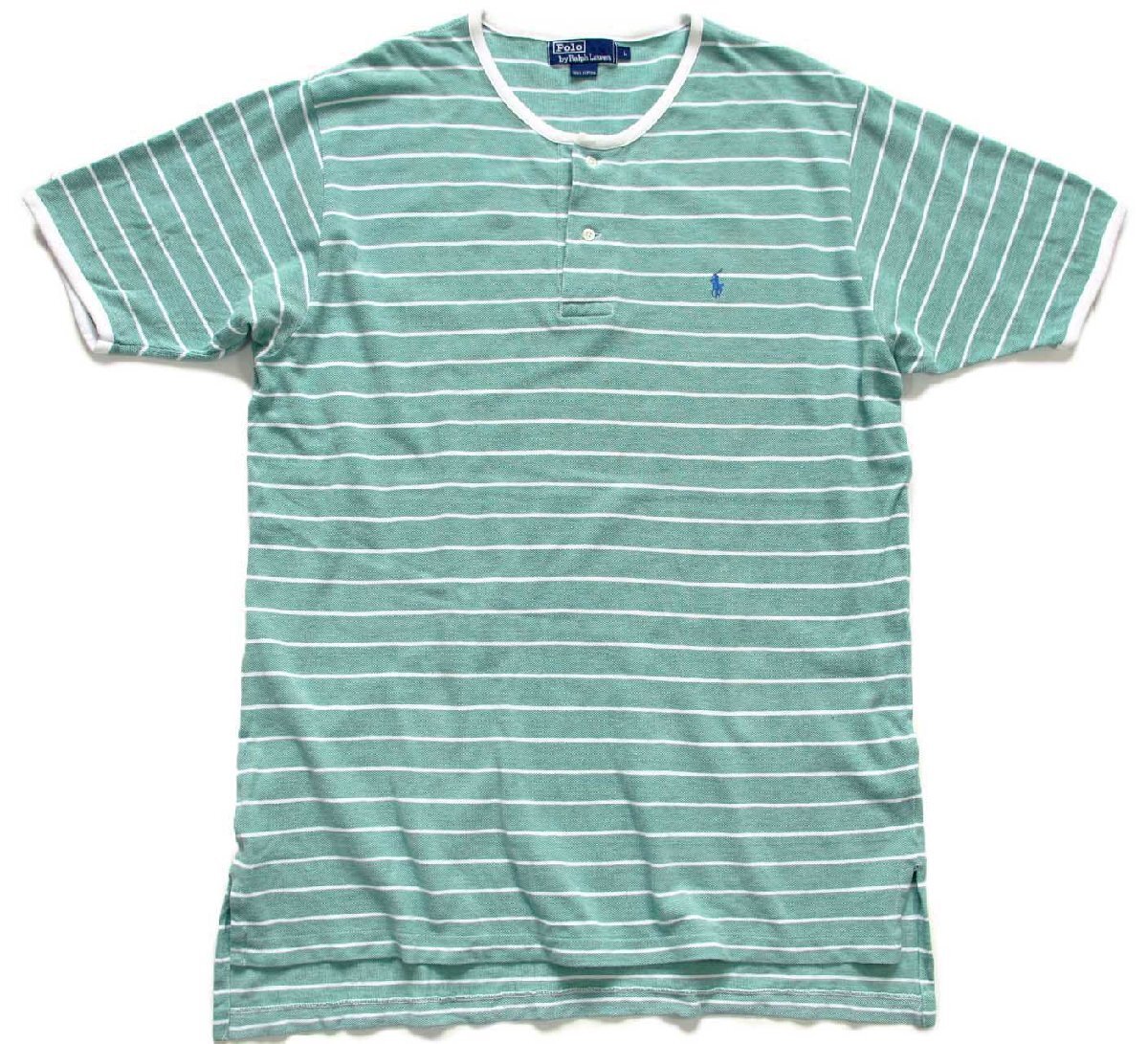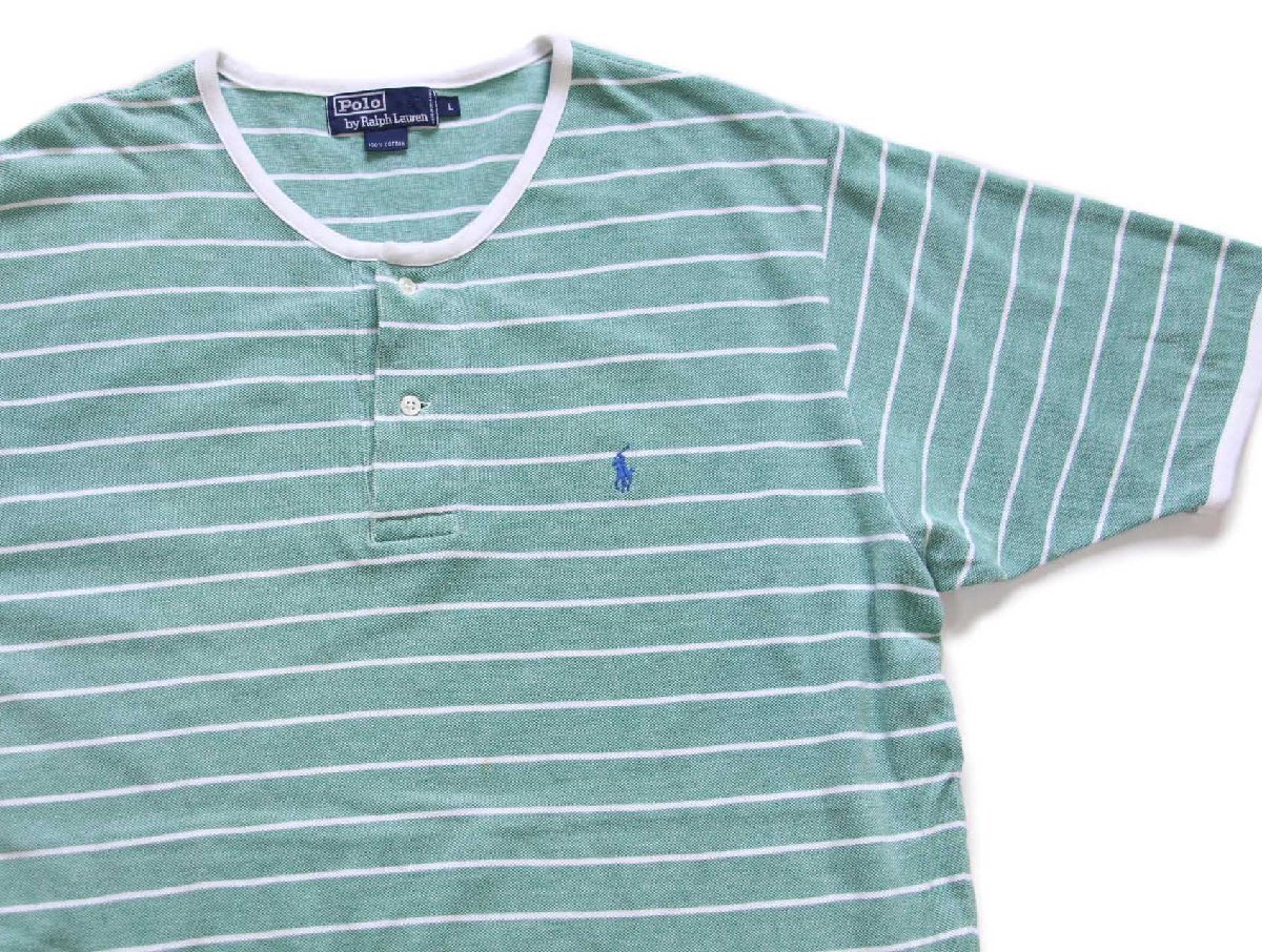 ★90s ポロ ラルフローレン ボーダー ヘンリーネック コットン 鹿の子 Tシャツ 薄緑×白 L★オールド ロゴ刺繍 ワンポイント ビッグサイズ