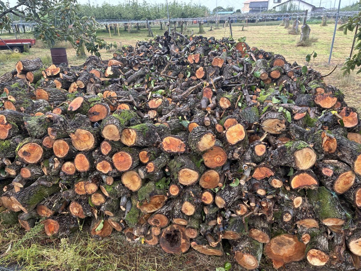 10月6日に150本の梨の木を伐採したばかりで、15トン 近くを畑から運び出して2カ所に集めて山積みしております。畑の中に入って積み込む必要はありません。