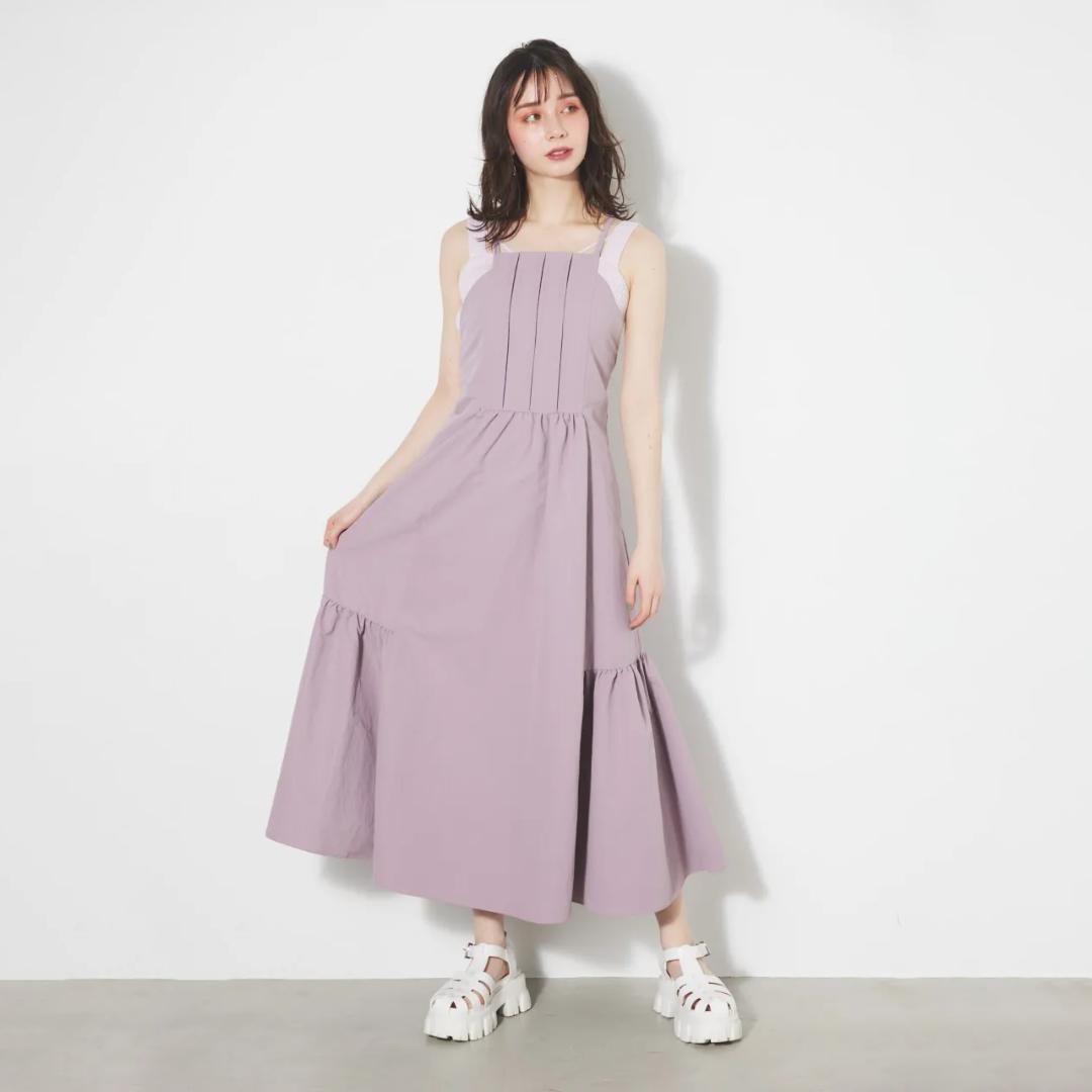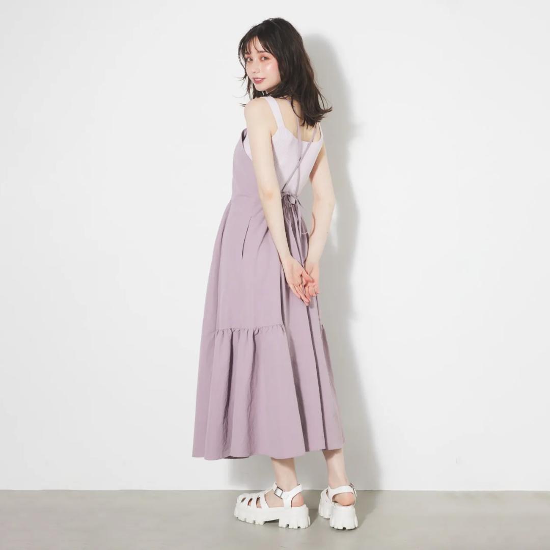 広幅のピンタックデザインがキャミソールを大人っぽく着られるデザインに仕上げました。背中に向かってクロスに入った紐が体にしなやかにフィットしつつ、ストレスフリーな着心地を実現しました。スカート部分はティアードデザインでだんだんと広がるシルエットが甘すぎずに大人っぽく着用出来ます。かさっとした絶妙な風合いの表地が夏に向けて着たくなるライトな雰囲気もPoint。インナーにキャミソールやタンクトップ等を合わせて自分好みのスタイルをお楽しみください。