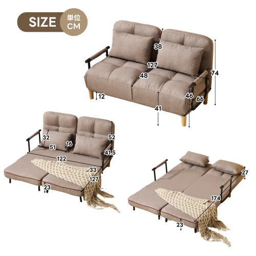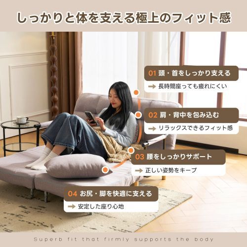 • 【一台四役】ソファとしては、長時間の読書や映画鑑賞でも疲れにくく快適な座り心地で、そして左右は独立で調整可能なので、カウチおよびソファ、自分の好みによってスタイルを選んでください。そしてベッドとしては幅122*174cmのサイズは広く、快適に休めいただけるように安心感を提供します。