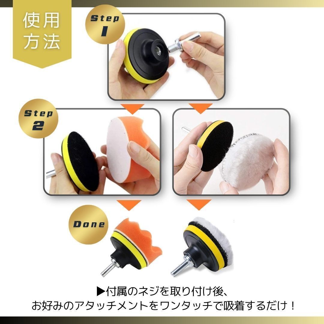 マジックテープ式で脱着する便利なポリッシャーは電動ドリルやグラインダーに取り付け可能です。