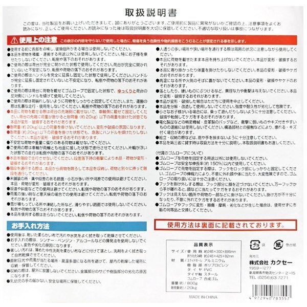 | ※ 取り扱い説明書をよくお読みになり、正しくご使用ください。 ※ 荷物を積載・運搬する用途以外には使用しないでください。特にお子様を乗せたりしないでください。 ※ 耐荷重以上の荷重を掛けないでください。変形や破損の原因になります。 ※ 組み立て・収納の際には手や指を挟まないように十分注意してください。 | |
