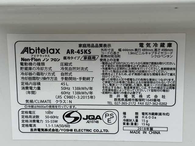 Abitelax 冷蔵庫 品番:AR-45KS サイズ:幅44×奥49×高50cm 1ドア ****************************** 問題なく動作します。 中古品の為、傷や汚れなどあります。 現状でのお渡しとなります。 お買い得商品、是非この機会に!!!