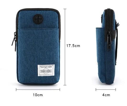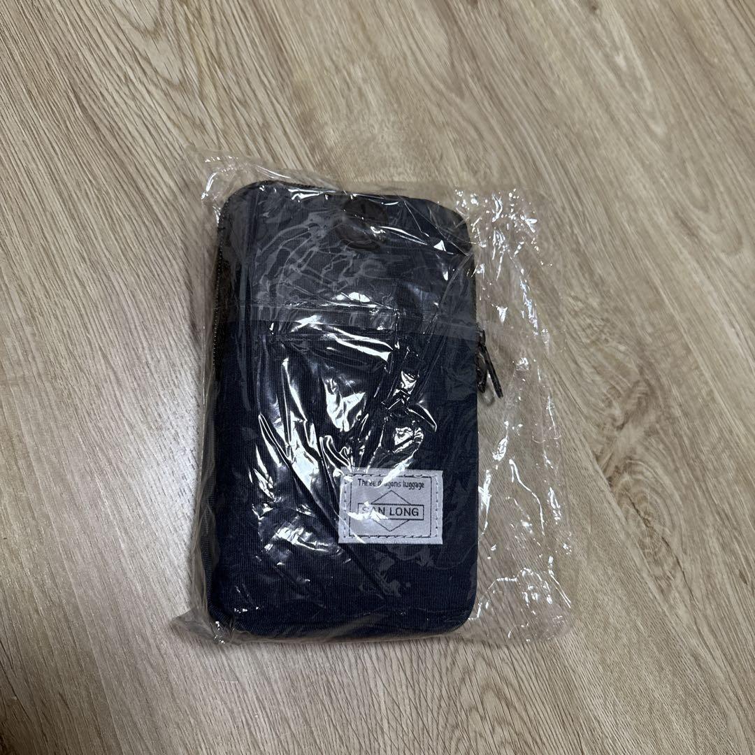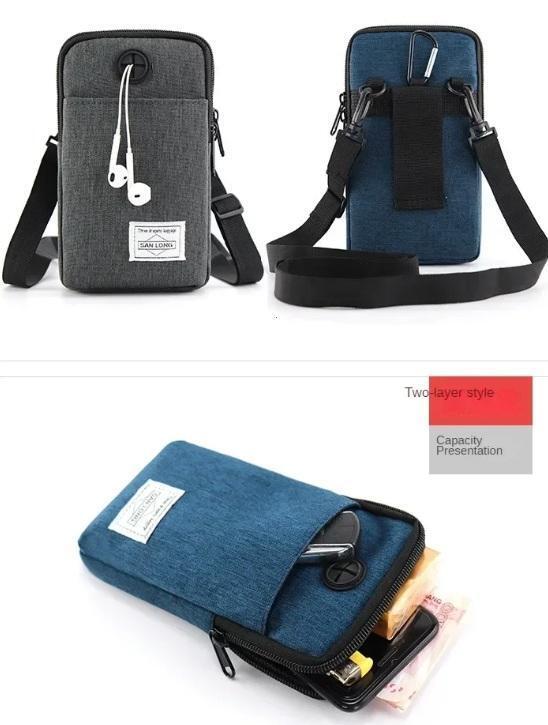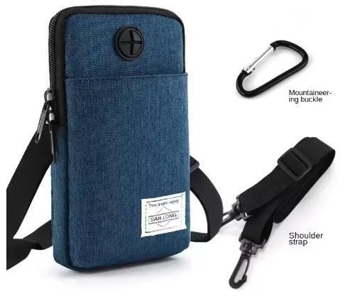 ダークブルーの二層式スマホショルダーバッグ、ショルダーストラップ付きで便利。