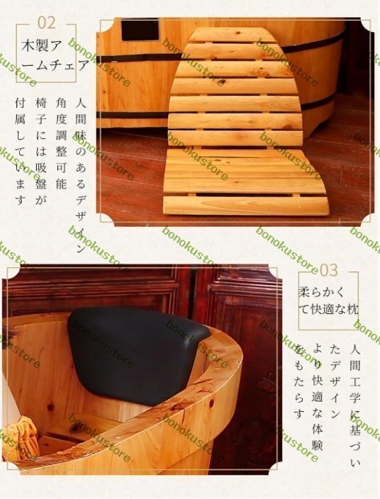 【商品詳細】★状態:新品未使用1木製浴槽:この天然香りの木製バスタブは、高品質な杉材を使用して作られています。自然な風合いと温かみがあり、心地よいバスタイムを提供します。木製の浴槽は熱や冷たさを伝えにくく、快適な入浴体験を実現します。製品仕様 100x62x72cm2美