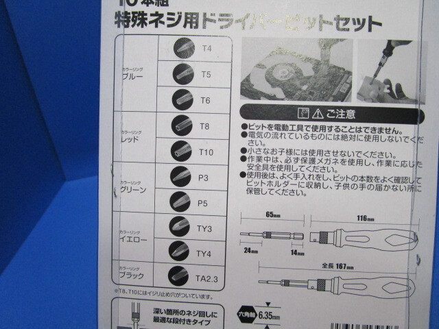 ●ビット10本/T4、T5、T6、T8、T10、P3、P5、TY3、TY4、TA2.3。●ハンドル/1本
