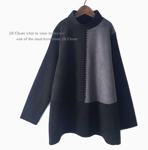 新品【送料185円】伸縮◎フロント刺繍*フェイクスエード×綺麗仕立てのニットソー*異素材切り替え*プルオーバー*チュニック7507.BKCC