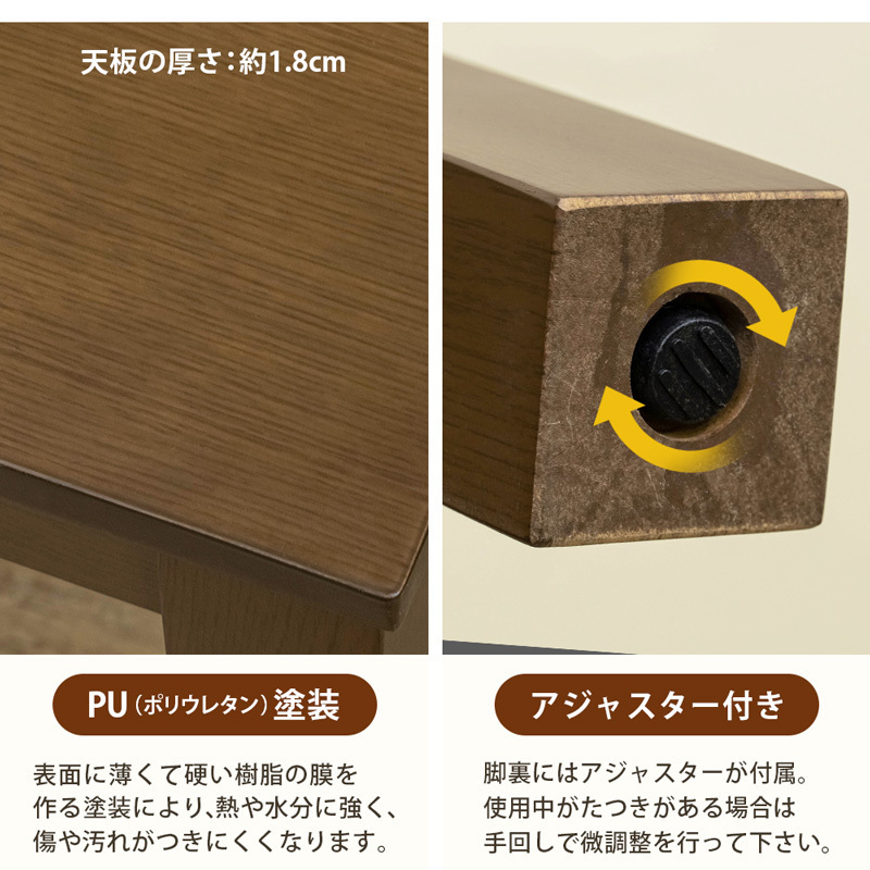| 材質 | 天板:天然木化粧繊維板 脚:天然木ラバーウッド ポリウレタン樹脂塗装 アジャスター付 |
