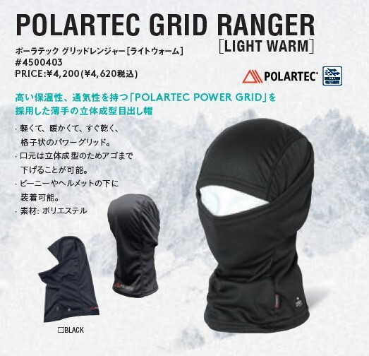 高い保温性、通気性を持つ「POLARTEC POWER GRID」を採用した薄手の立体成型目出し帽